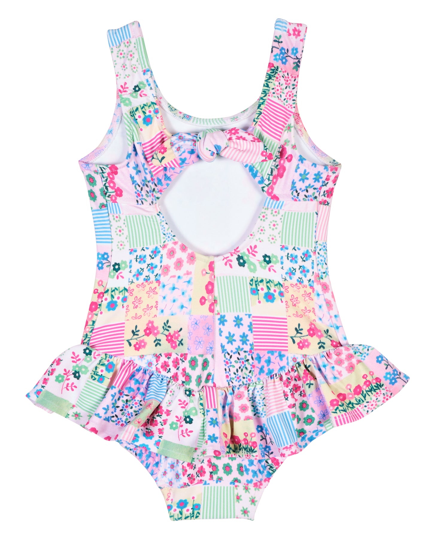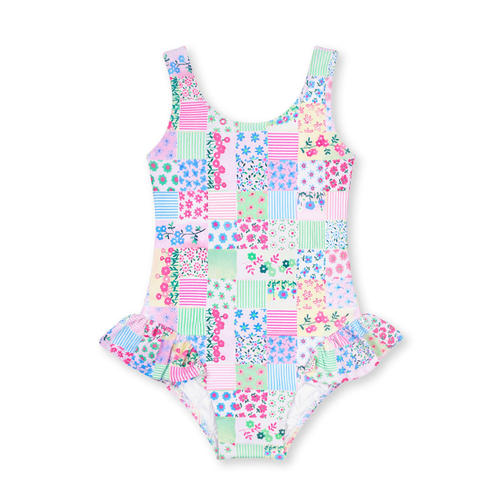 Regular price $100.00Bright and full of charm, this swimsuit features a multicolor floral patchwork print on soft, stretchy swim fabric for all-day comfort. Playful hip ruffles add movement and flair, while a back tie allows for an adjustable, just-right fit.