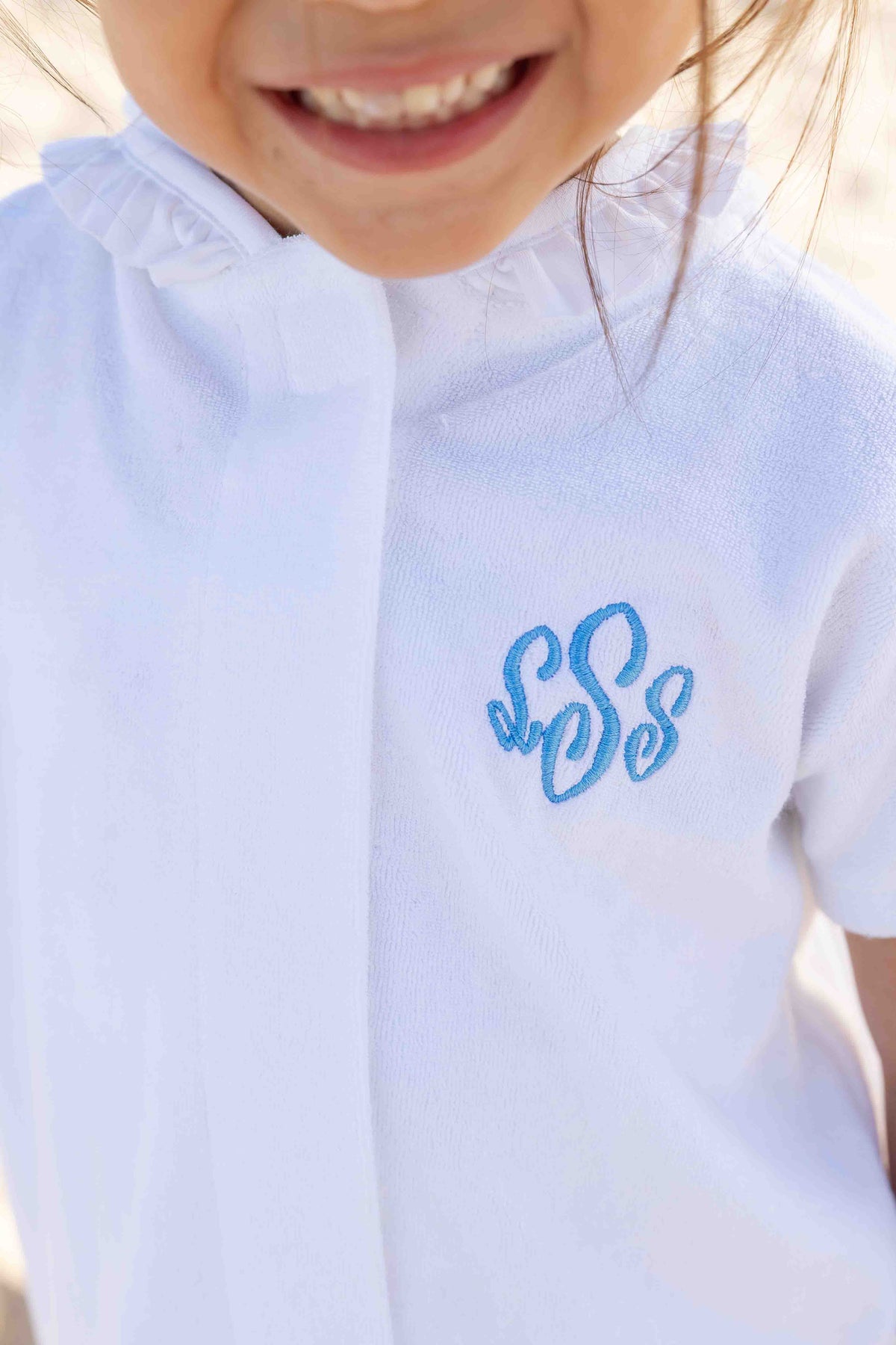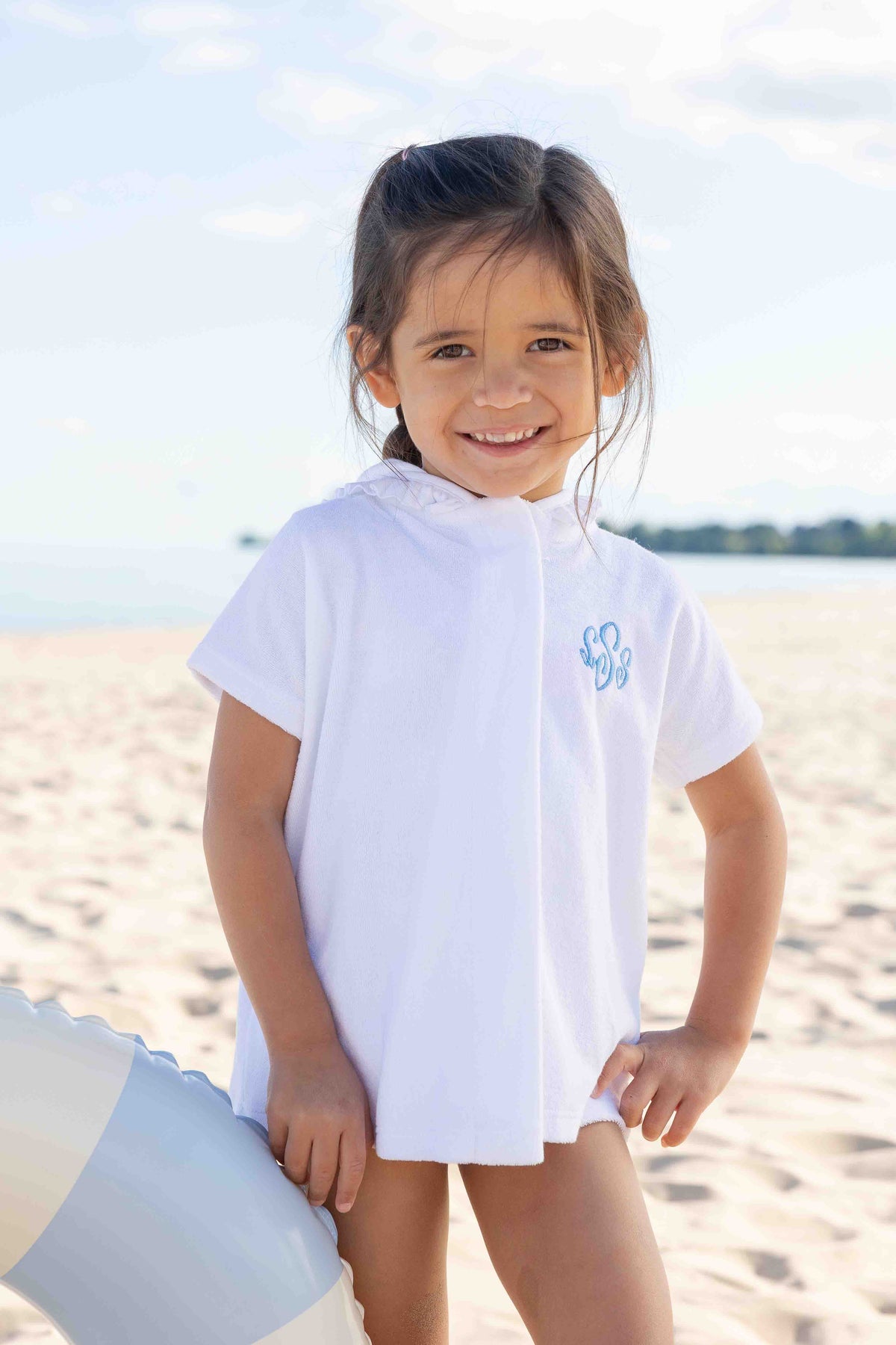 Our all-purpose white knitted terry cloth cover up is a wardrobe staple for every little girl. Kimono sleeves and a Velcro closure make this an easy on and off. The ruffle trimmed hood is a perfect warm up for your little one when she gets out of the pool!