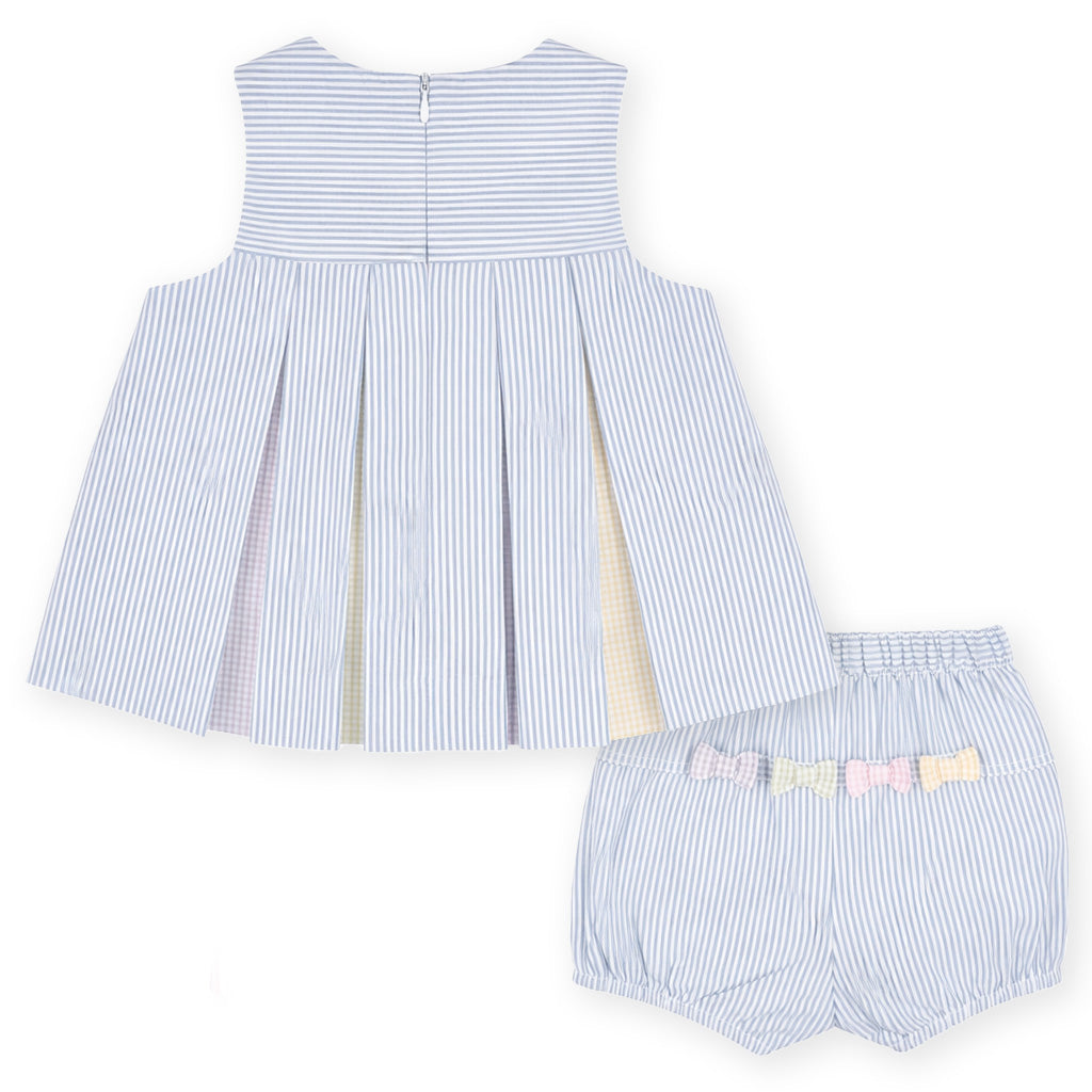 Regular price $120.00Classic and sweet, this two-piece dress is crafted from soft 100% cotton seersucker in medium blue and white stripes. Pleats and bows in multicolor check seersucker add a playful pop of color, creating a fresh, cheerful look perfect for warm days.