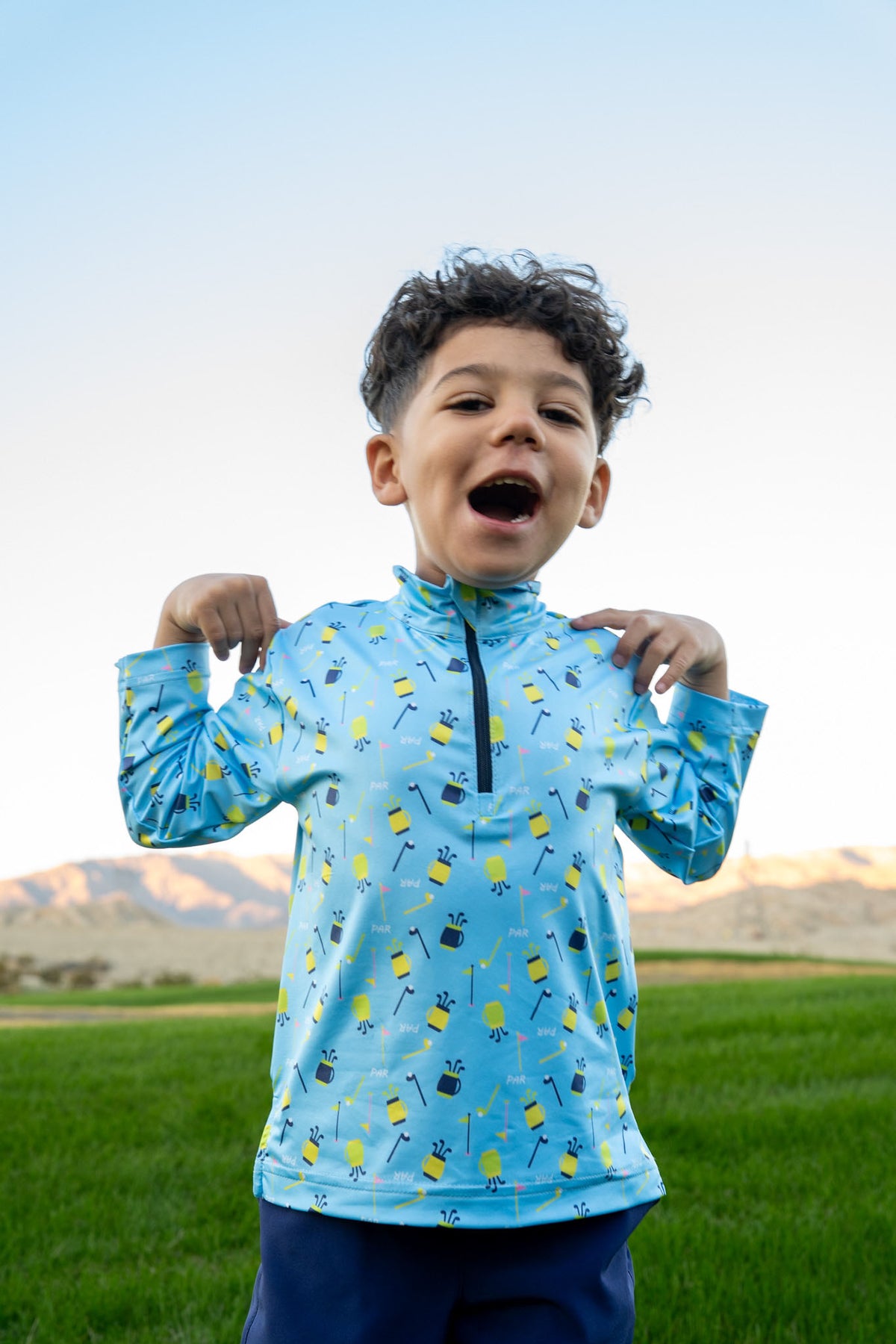 Regular price $84.00Sporty and versatile, this half-zip is crafted from blue golf print performance knit with soft stretch for easy movement and all-day comfort. A front zipper adds a polished, athletic touch, while side vents keep the fit relaxed and breathable during warm-weather activities.