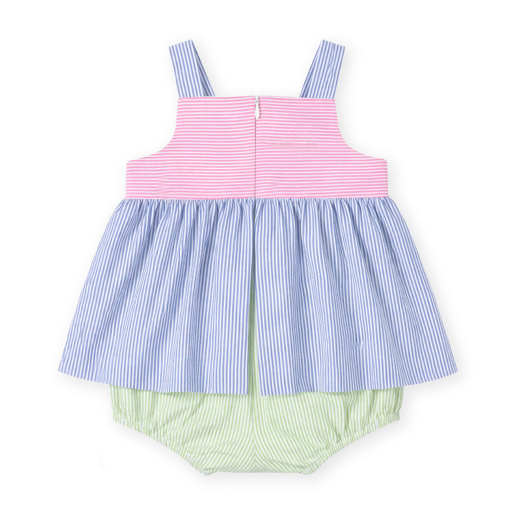 Regular price $112.00Bright and playful in classic Eiseman fashion, this vintage-inspired romper is crafted from vibrant pink, royal, and lime seersucker for a lightweight, breezy feel perfect for enjoying days in the sun. A bold pink appliqué flower pops against lime stripe binding, adding cheerful color and standout detail.