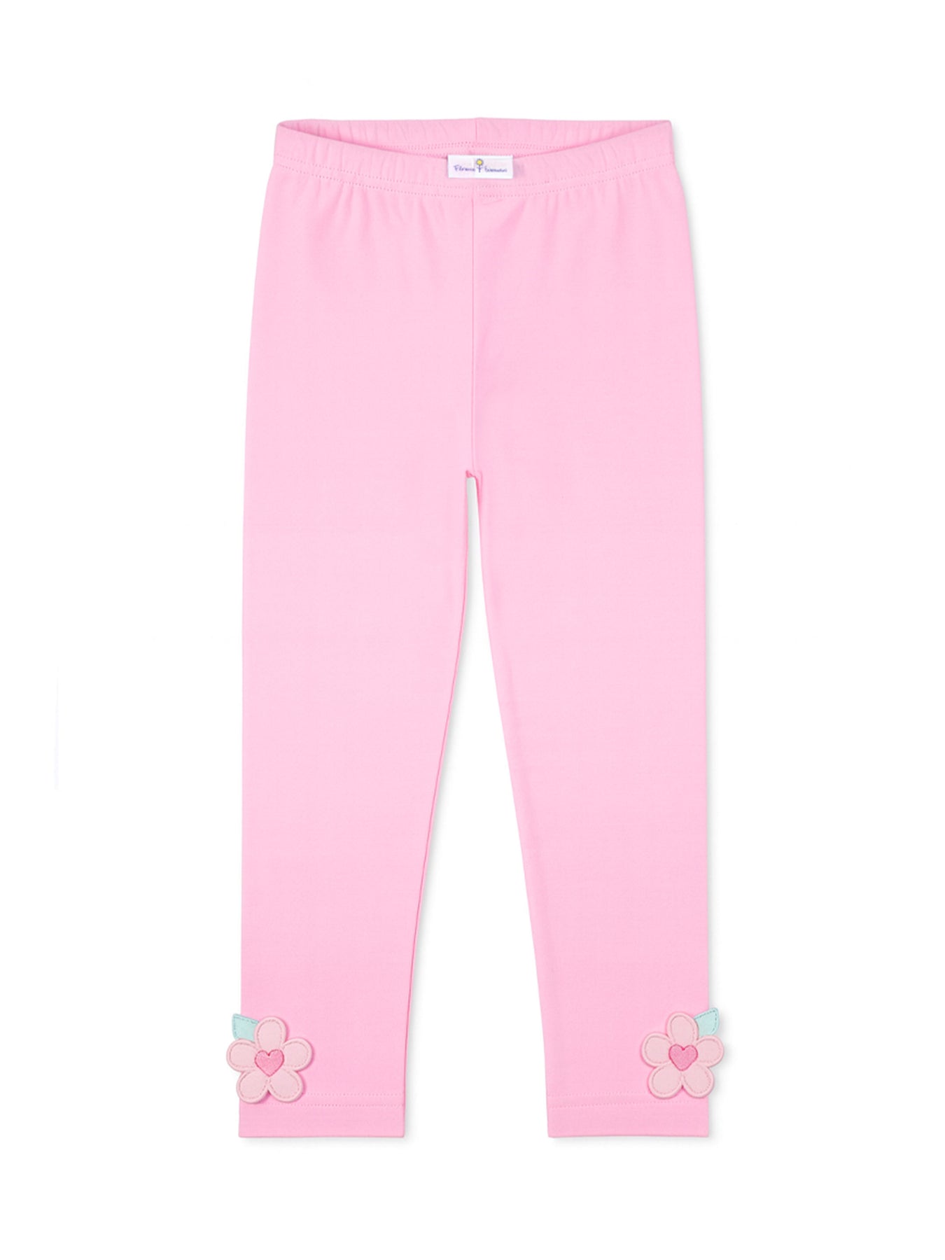 Regular price $48.00A cheerful twist on a classic, these pink jersey knit leggings feature appliqué flowers with heart centers at the outer ankles for a playful finish. Crafted from a soft cotton-spandex blend, they offer gentle stretch for comfort and easy movement.