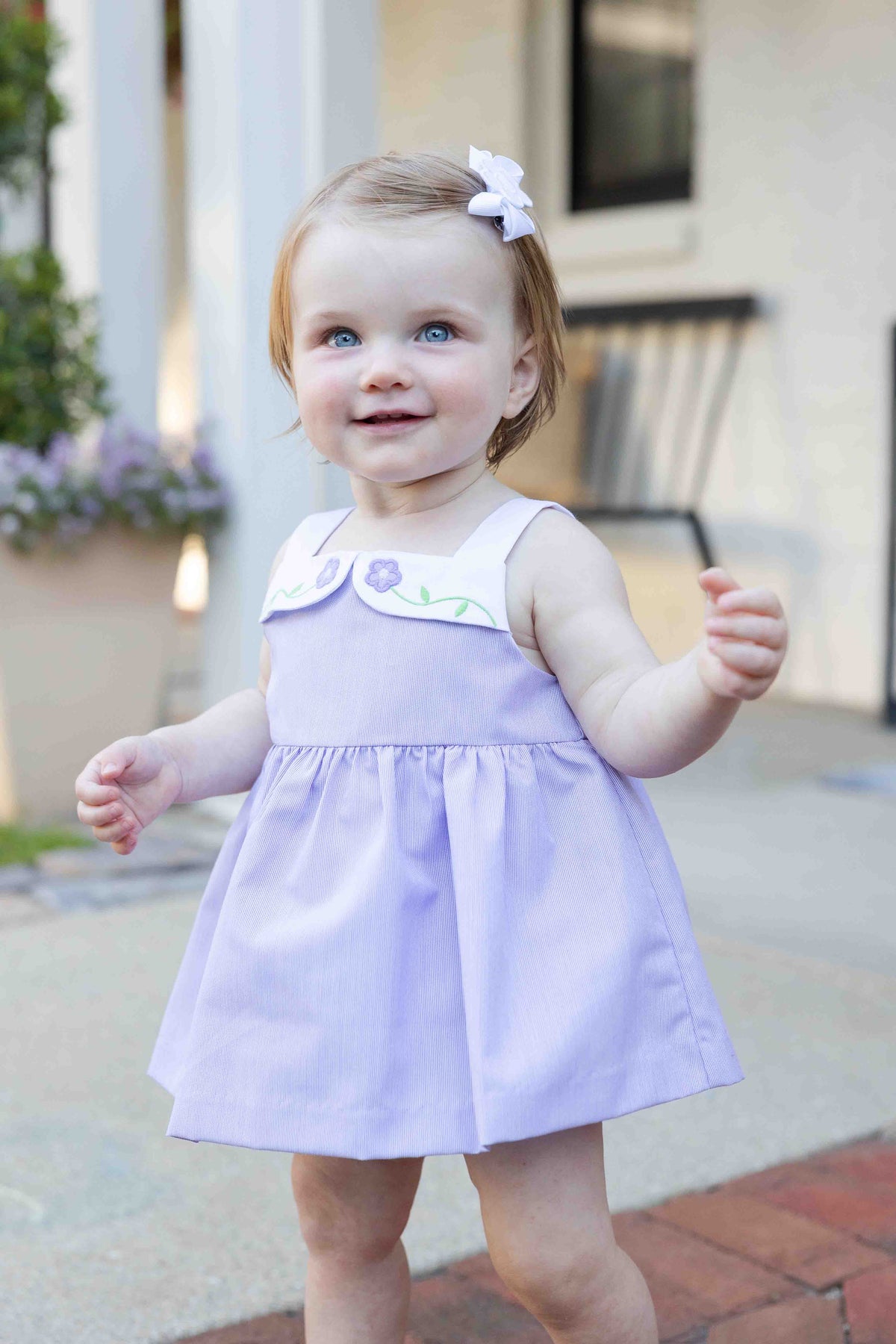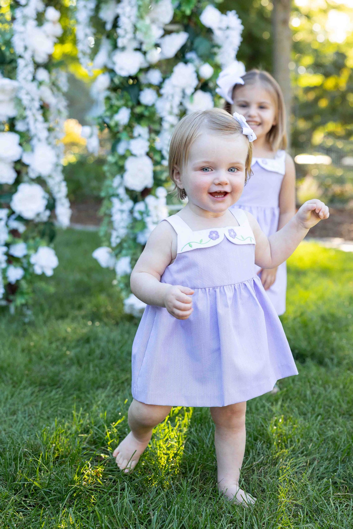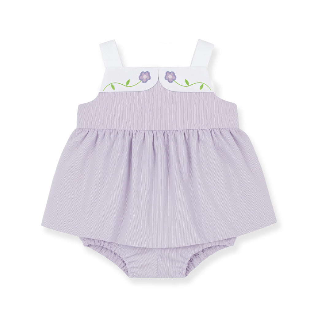 Regular price $104.00Soft and sweet for springtime days, this romper is crafted from lavender and white pincord with a crisp white finewale piqué accent for a polished finish. Appliqué flowers and leaves add delicate charm, creating a look that feels both playful and special for the season.