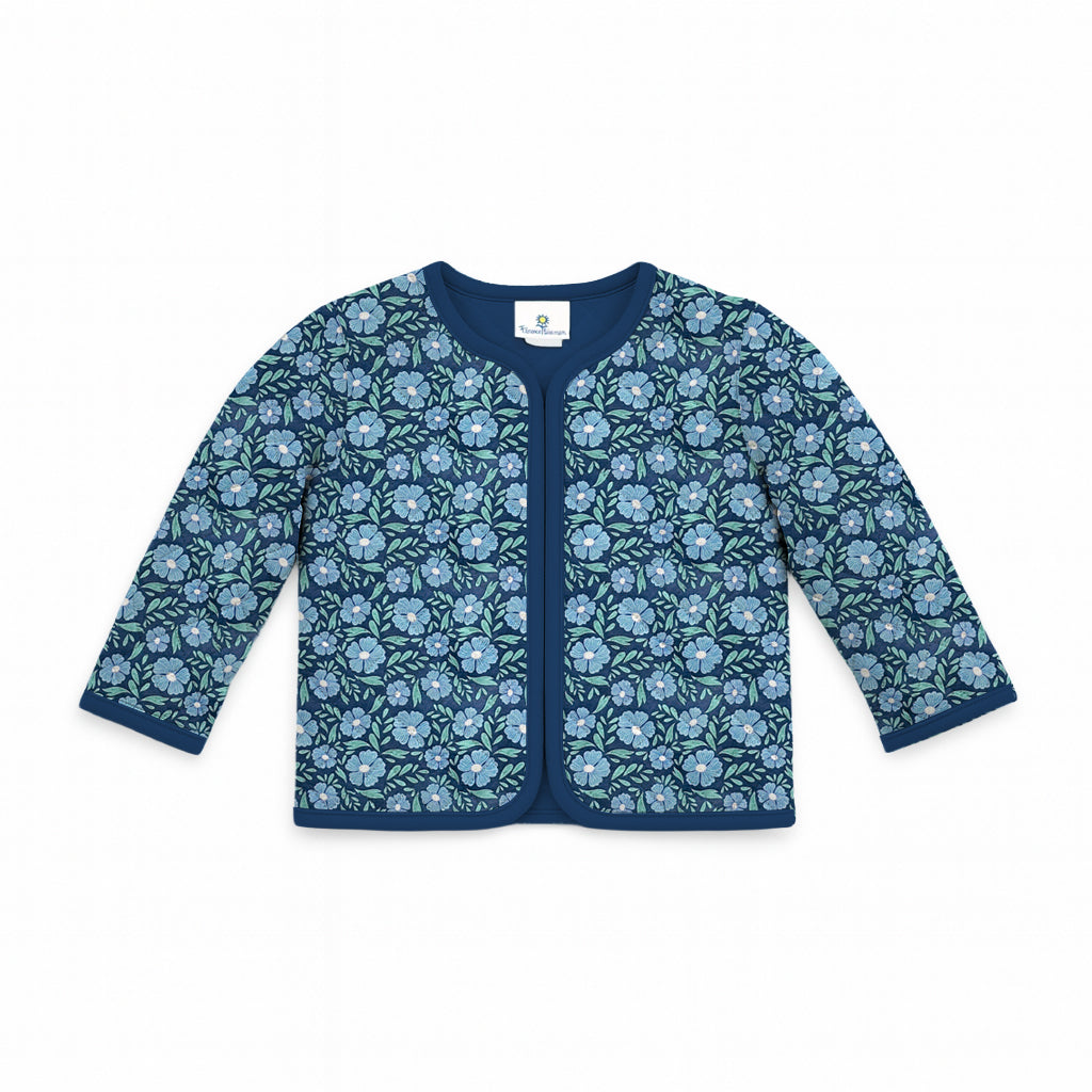 Regular price $120.00 Sale price $78.00Wrap her in cozy charm with this quilted cotton jacket, featuring our signature navy and blue floral print. Fully lined in solid navy poplin with matching binding, it blends warmth and whimsy for cooler days. A classic hook-and-eye closure at the center front offers a neat, polished finish—perfect for layering over school looks or dressing up for special outings.