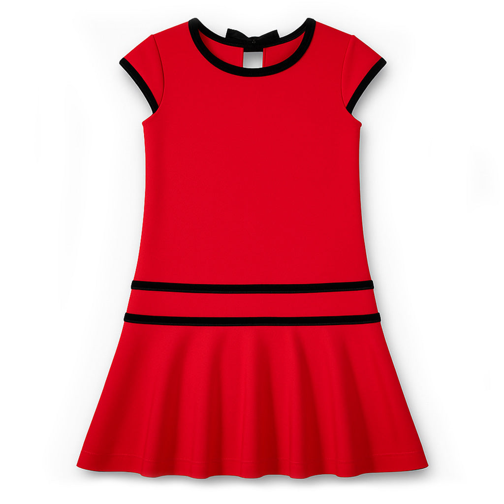 Elegant and festive, this dress is crafted from rich red crepe scuba knit with a soft stretch for comfort and ease. A delicate ruffle neckline trimmed in velvet adds heirloom charm, while the classic silhouette is designed to flatter and photograph beautifully. Perfect for Thanksgiving gatherings, holiday portraits, and special seasonal celebrations.