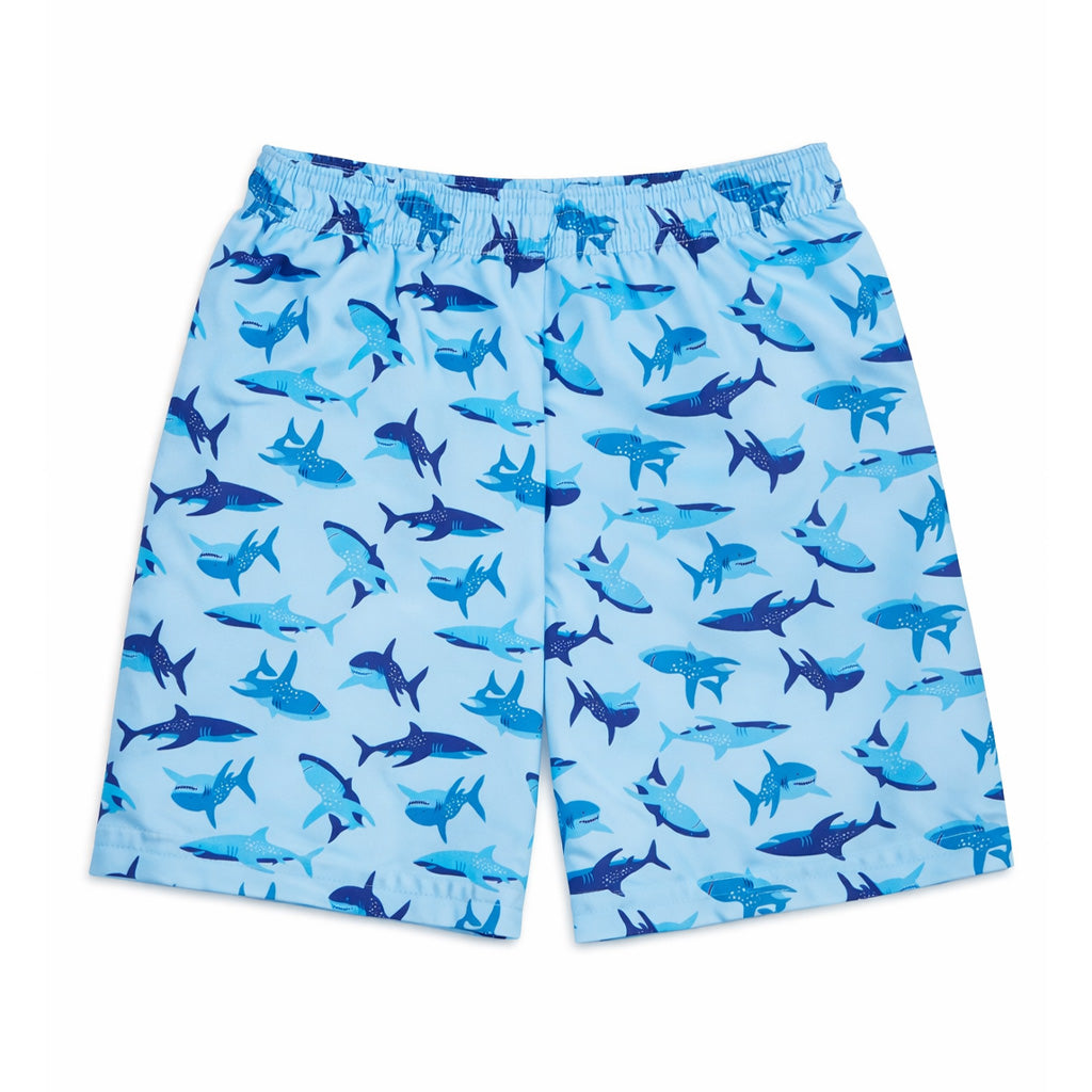 close up of boy wearing shark swim trunks