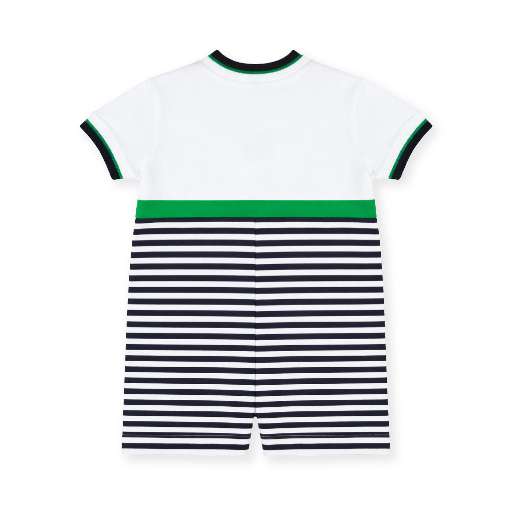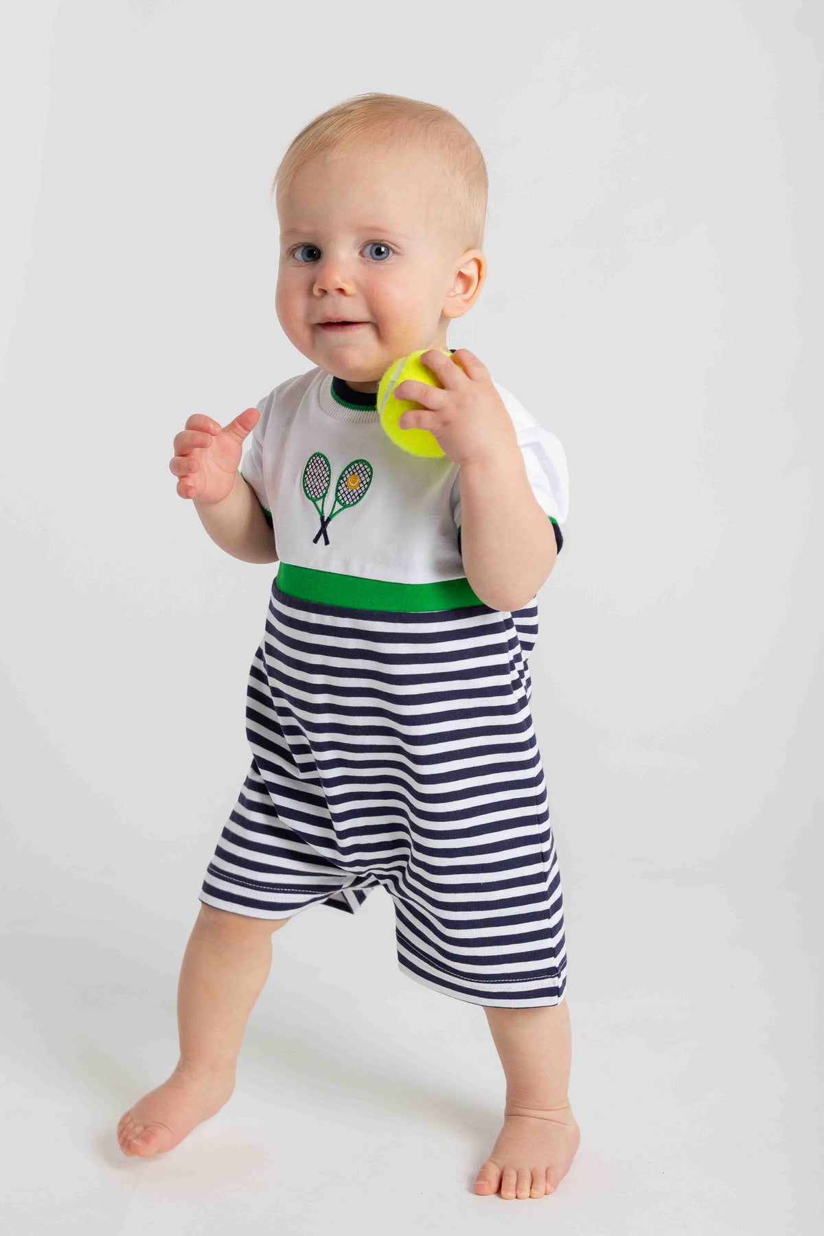 Regular price $88.00Navy and white stripes create a timeless backdrop for this charming knit shortall, finished with embroidered tennis rackets for a playful nod to classic sport style.