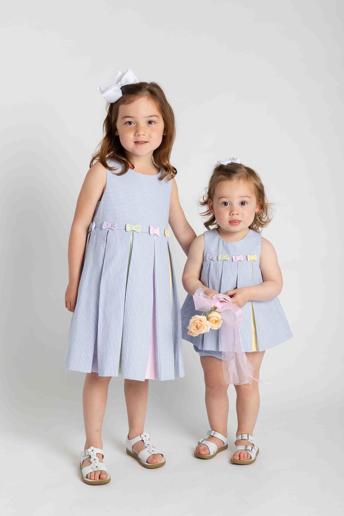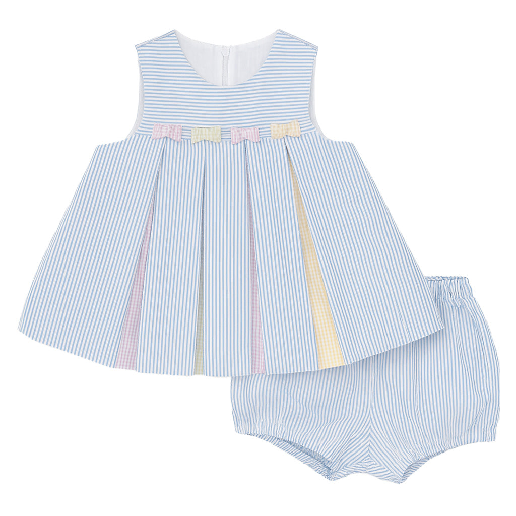 Regular price $120.00Classic and sweet, this two-piece dress is crafted from soft 100% cotton seersucker in medium blue and white stripes. Pleats and bows in multicolor check seersucker add a playful pop of color, creating a fresh, cheerful look perfect for warm days.