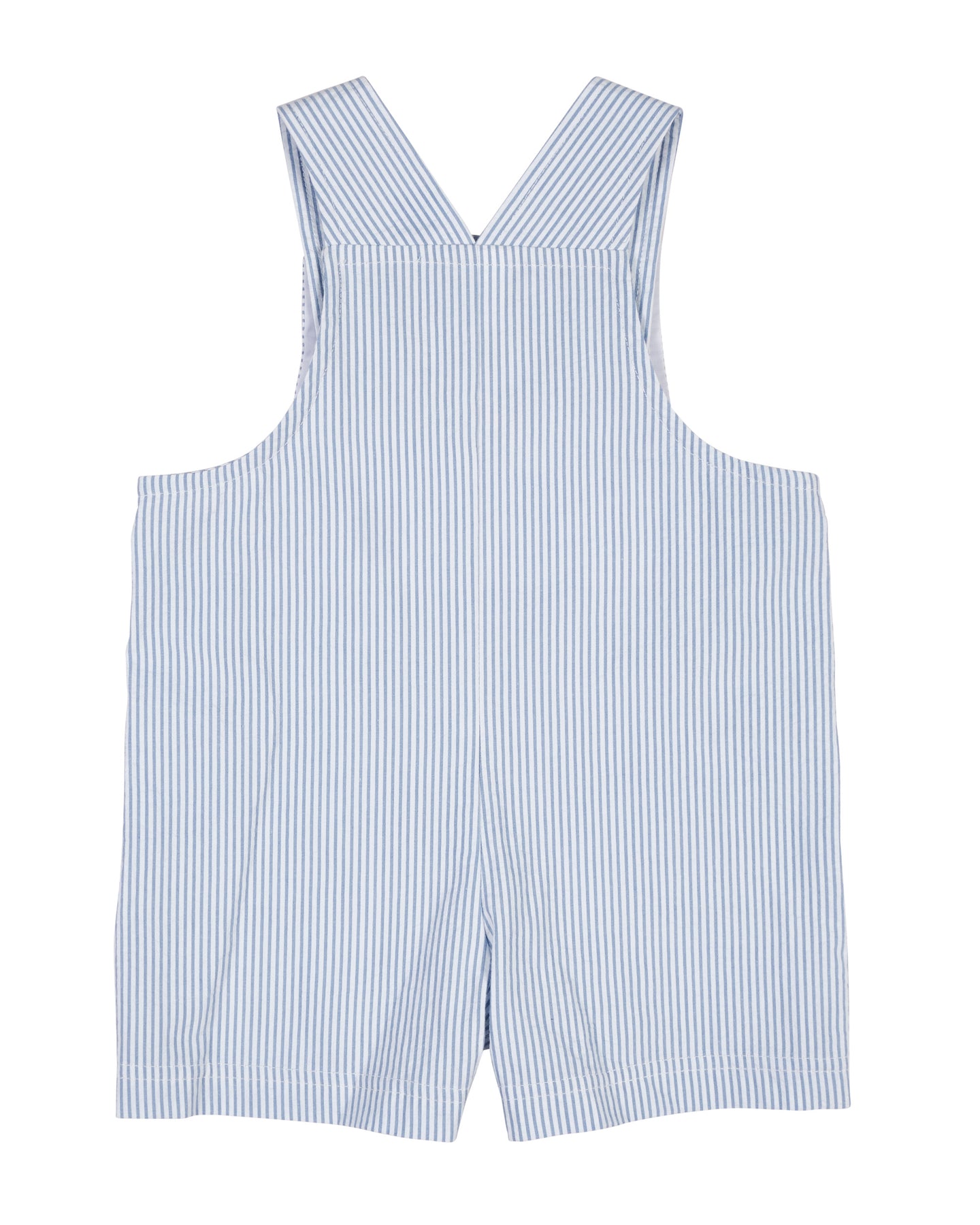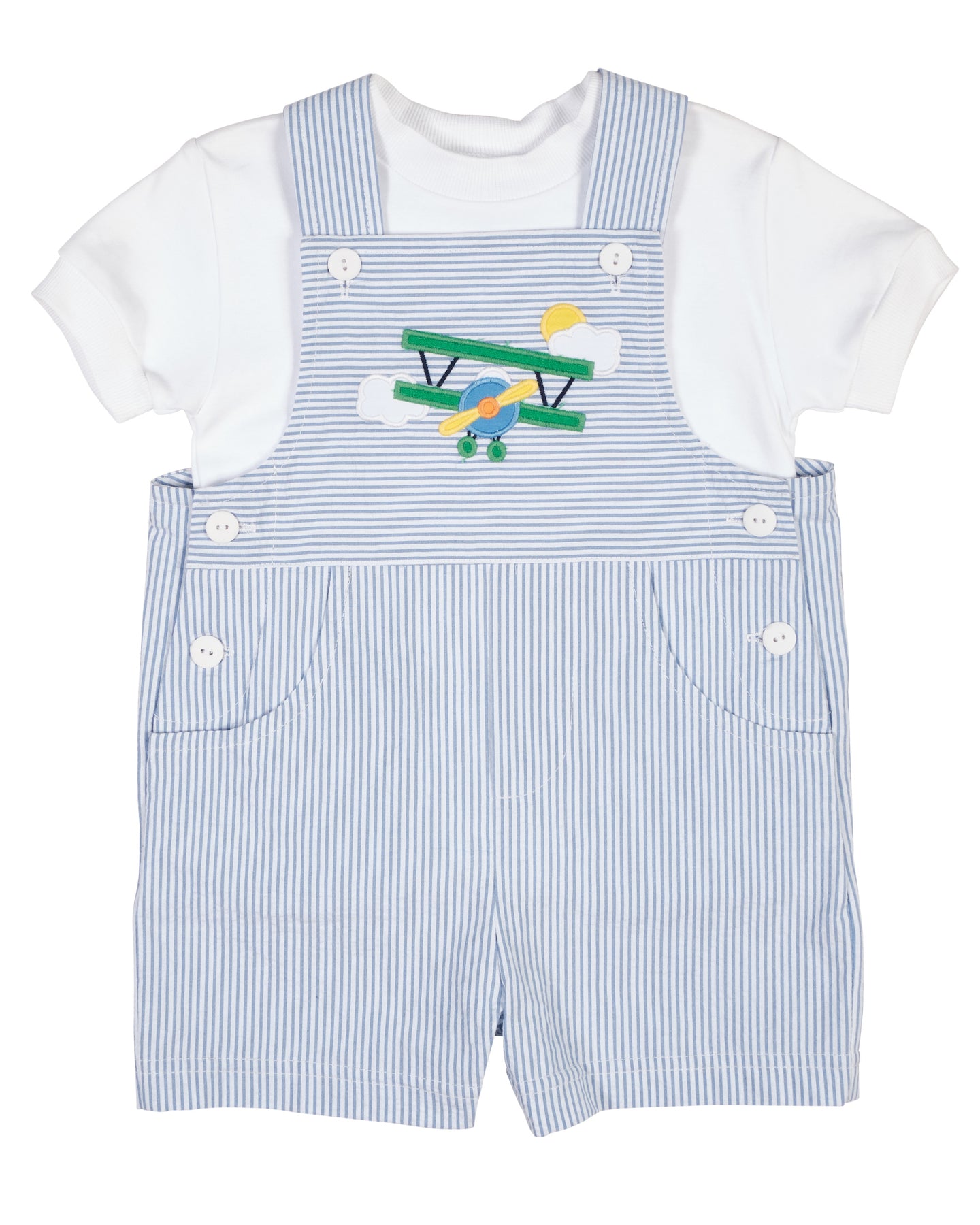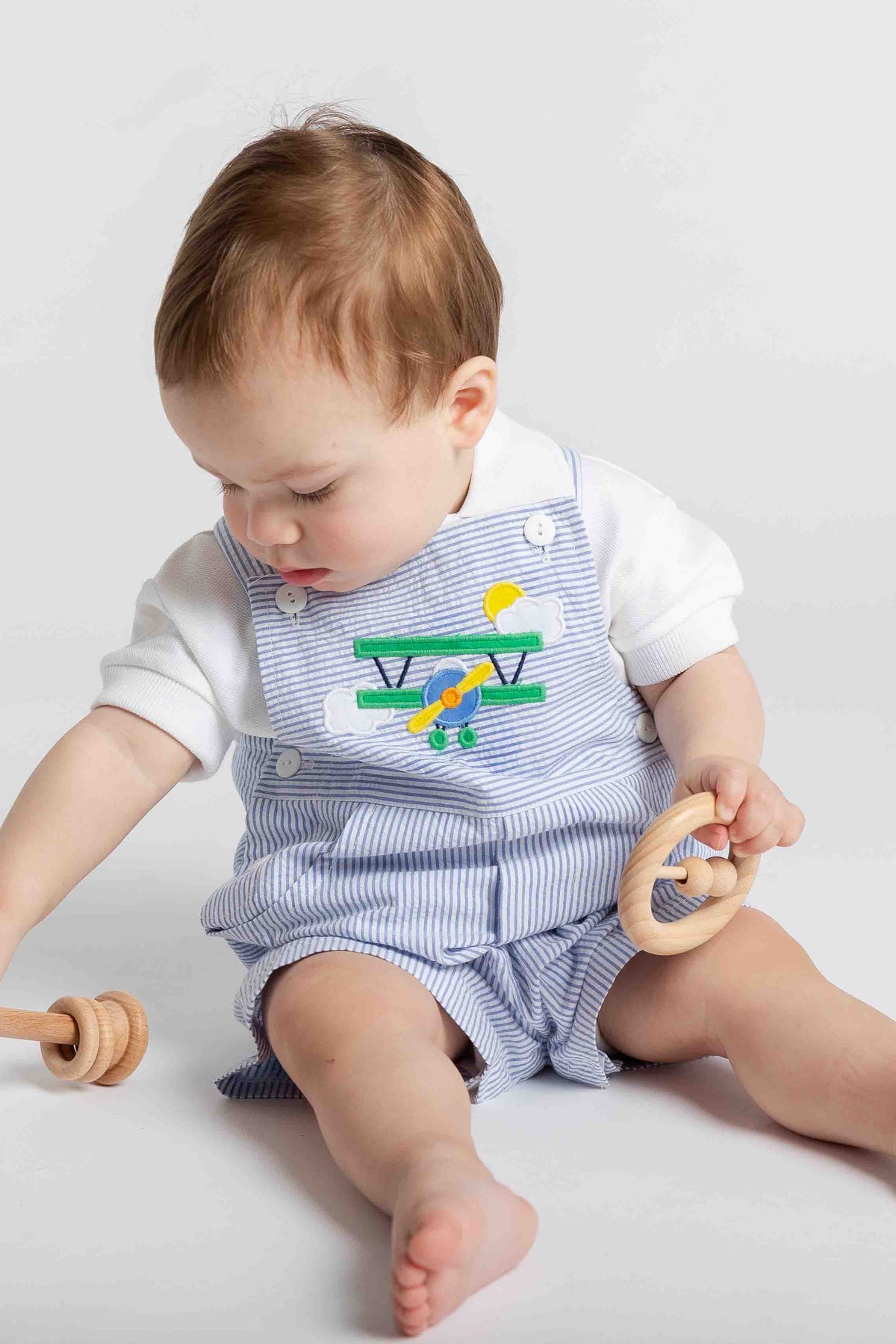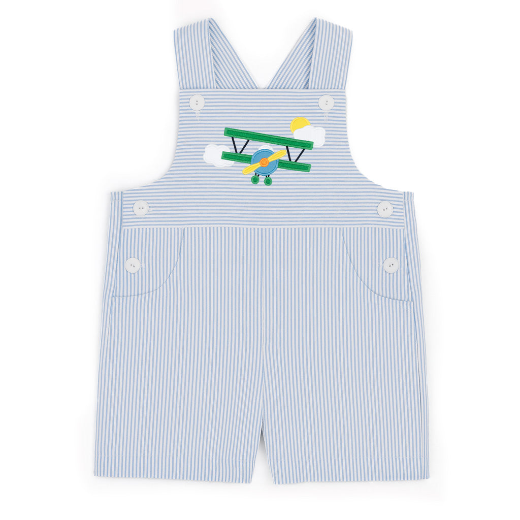 Classic and full of charm, this shortall is crafted from medium blue and white stripe seersucker in soft 100% cotton. A vintage airplane appliqué adds a playful, nostalgic touch, perfect for sunny days and family getaways.