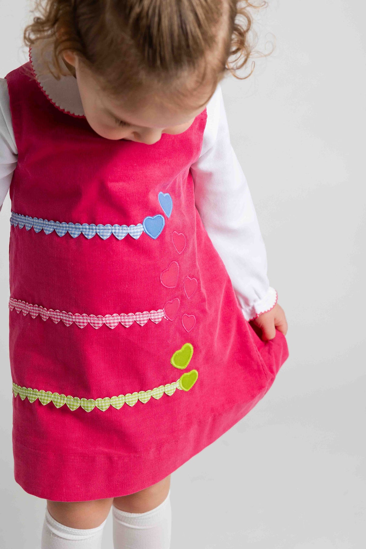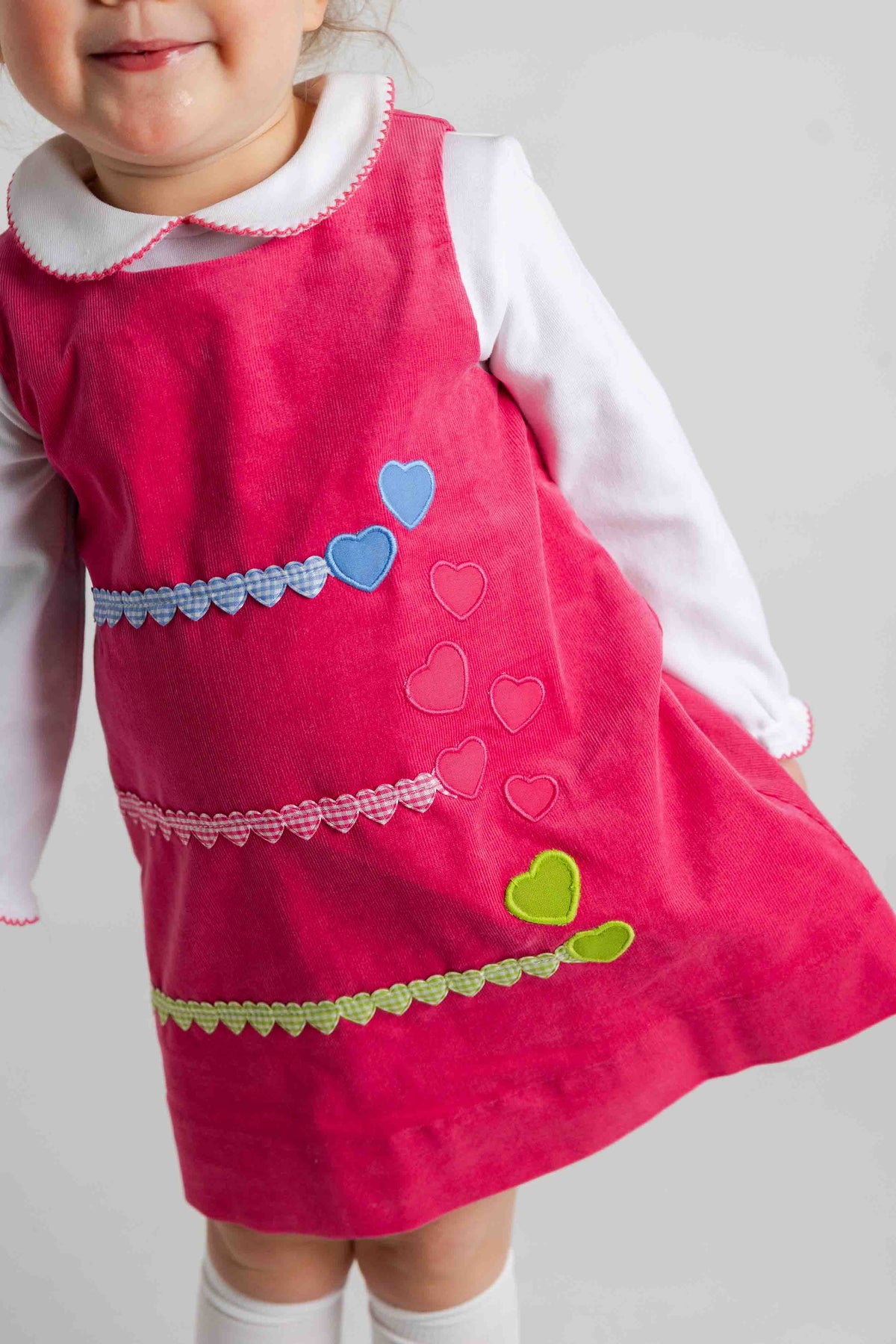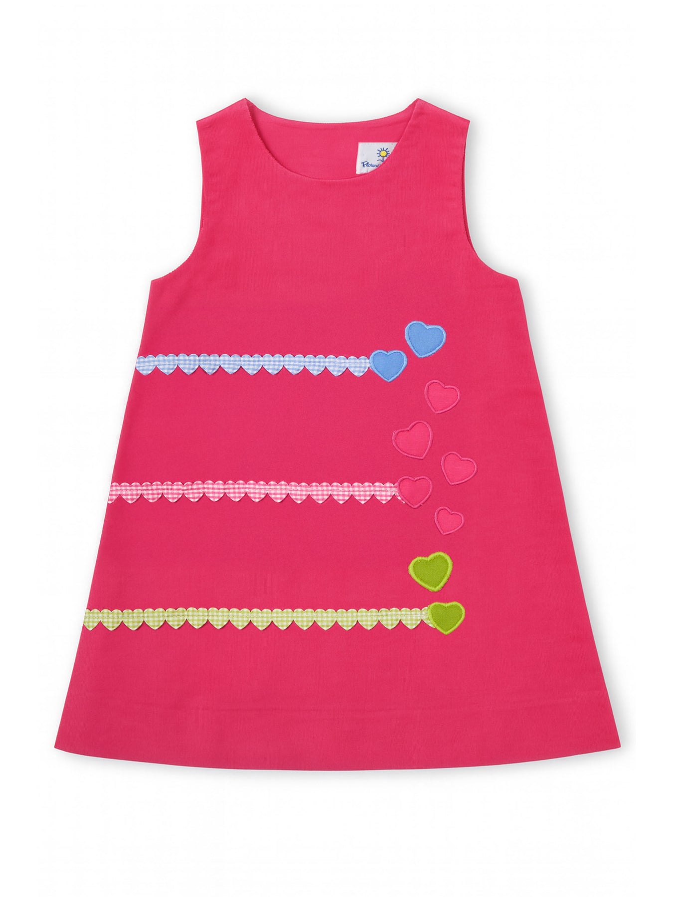 Bright and playful, this jumper is made from vivid pink 21 wale corduroy for a soft yet structured look. Colorful appliqué hearts in pink, green, and blue dance across the front, framed with coordinating gingham heart trim for extra charm.