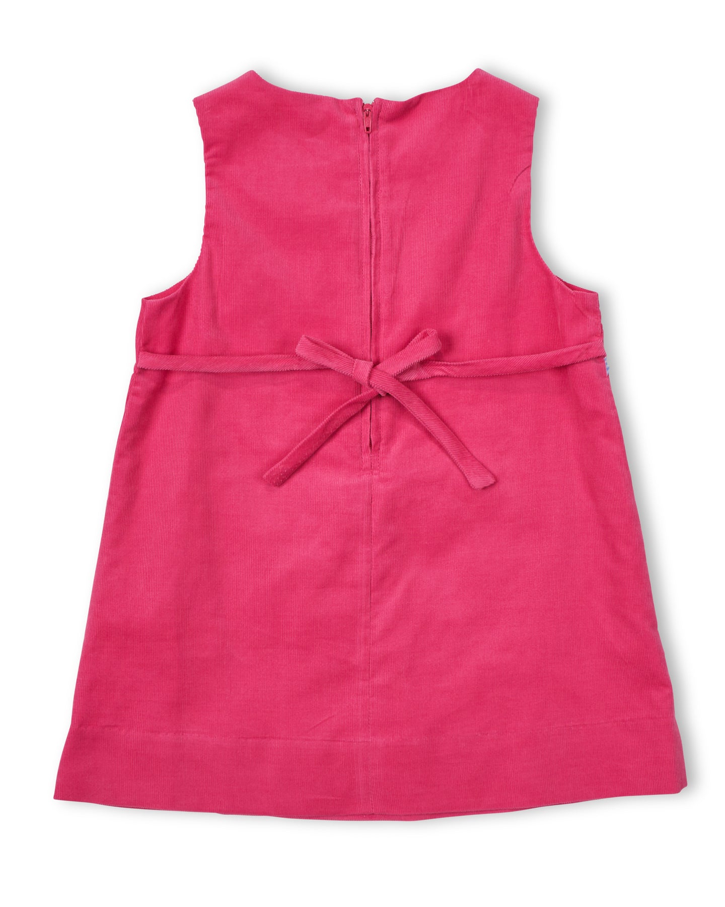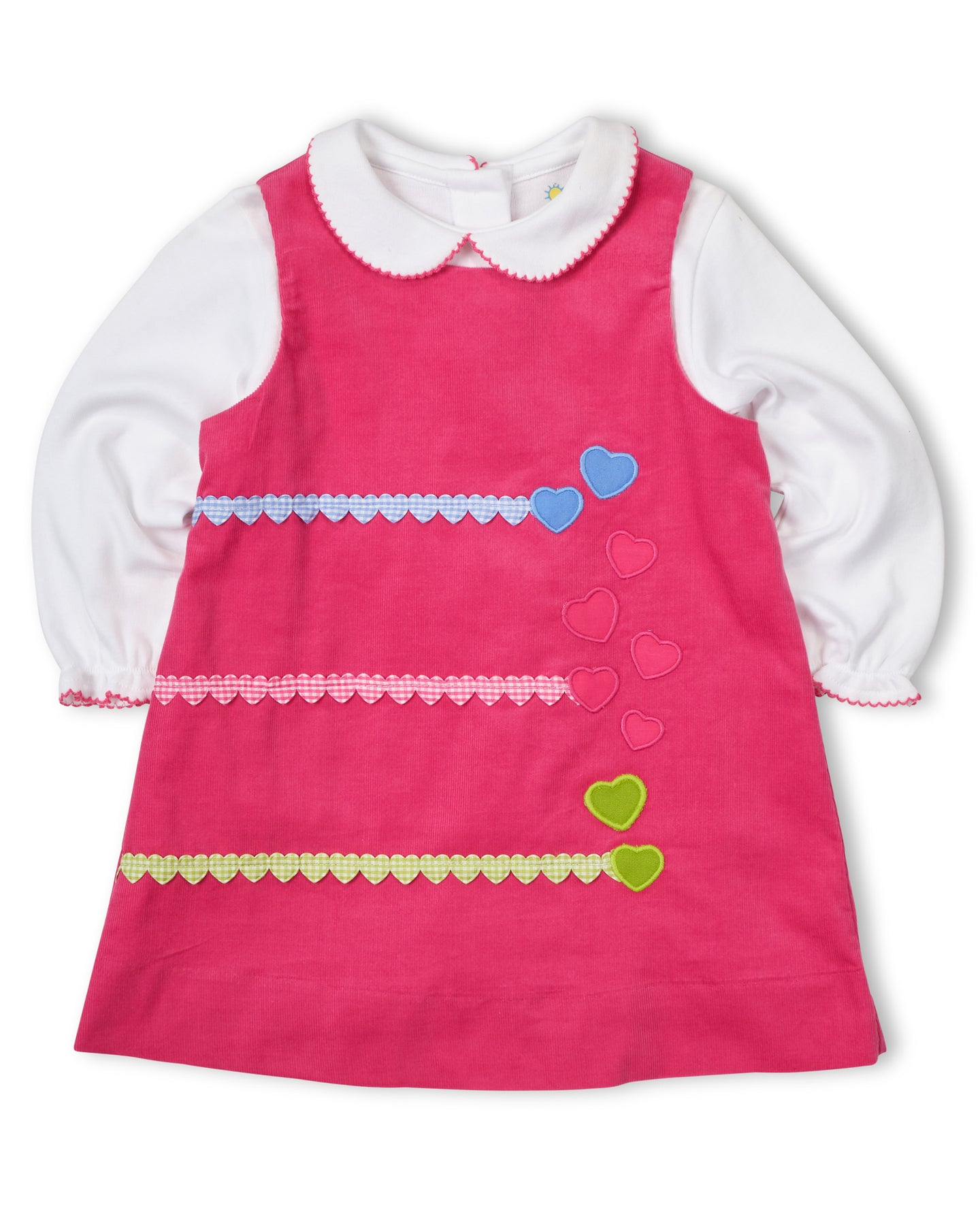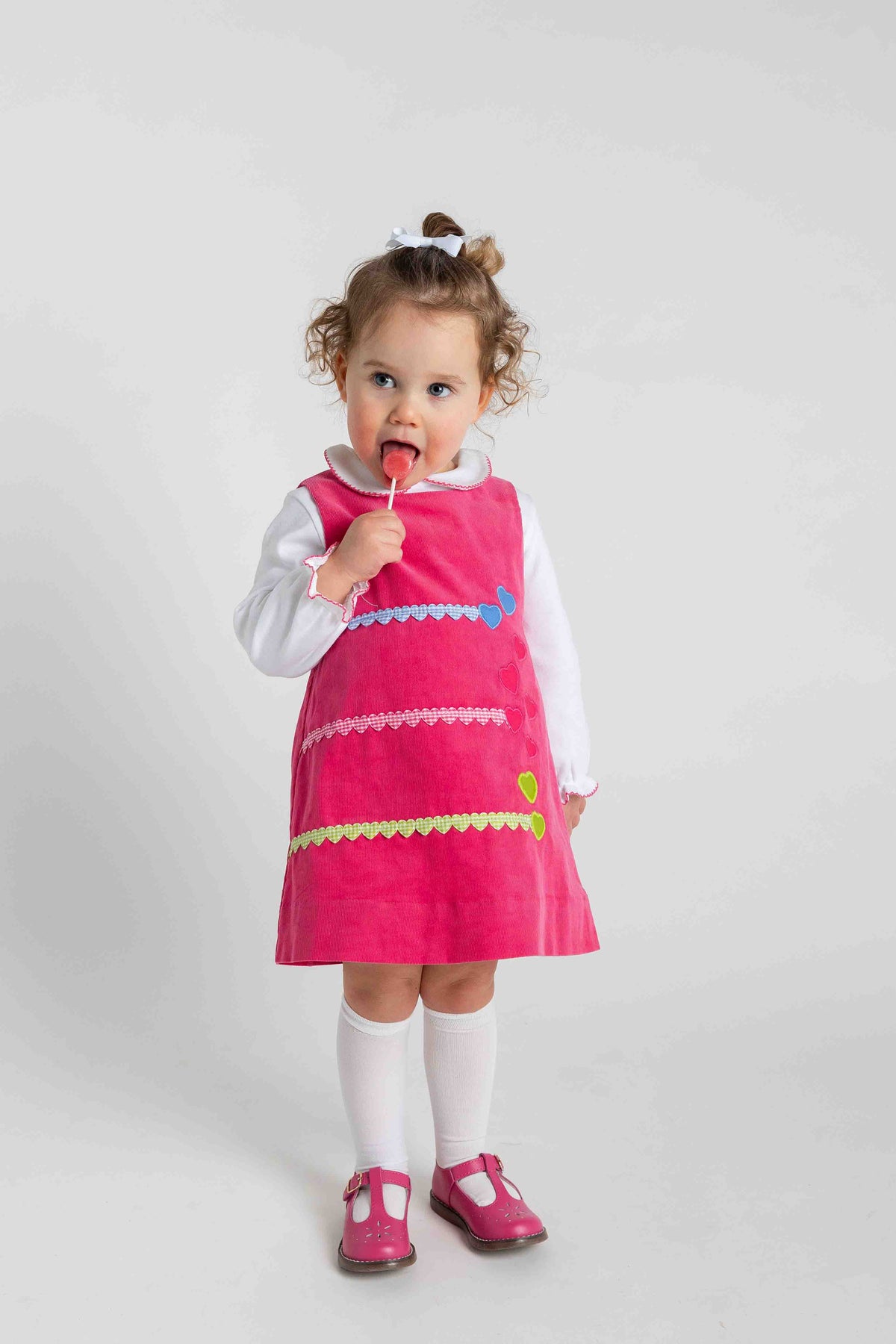 Bright and playful, this jumper is made from vivid pink 21 wale corduroy for a soft yet structured look. Colorful appliqué hearts in pink, green, and blue dance across the front, framed with coordinating gingham heart trim for extra charm.