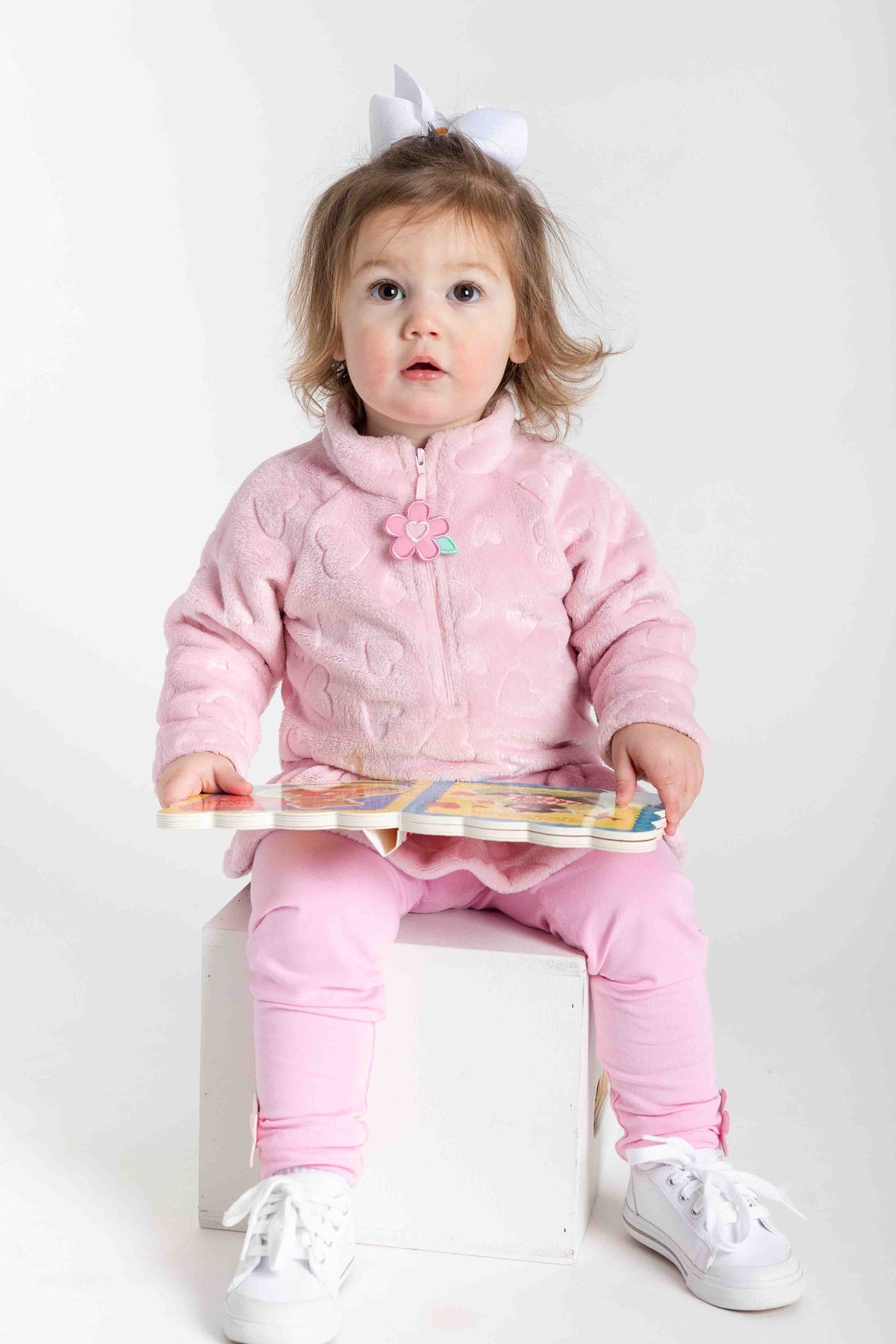 Child wearing a pink outfit with a bow, sitting on a white block holding a book.