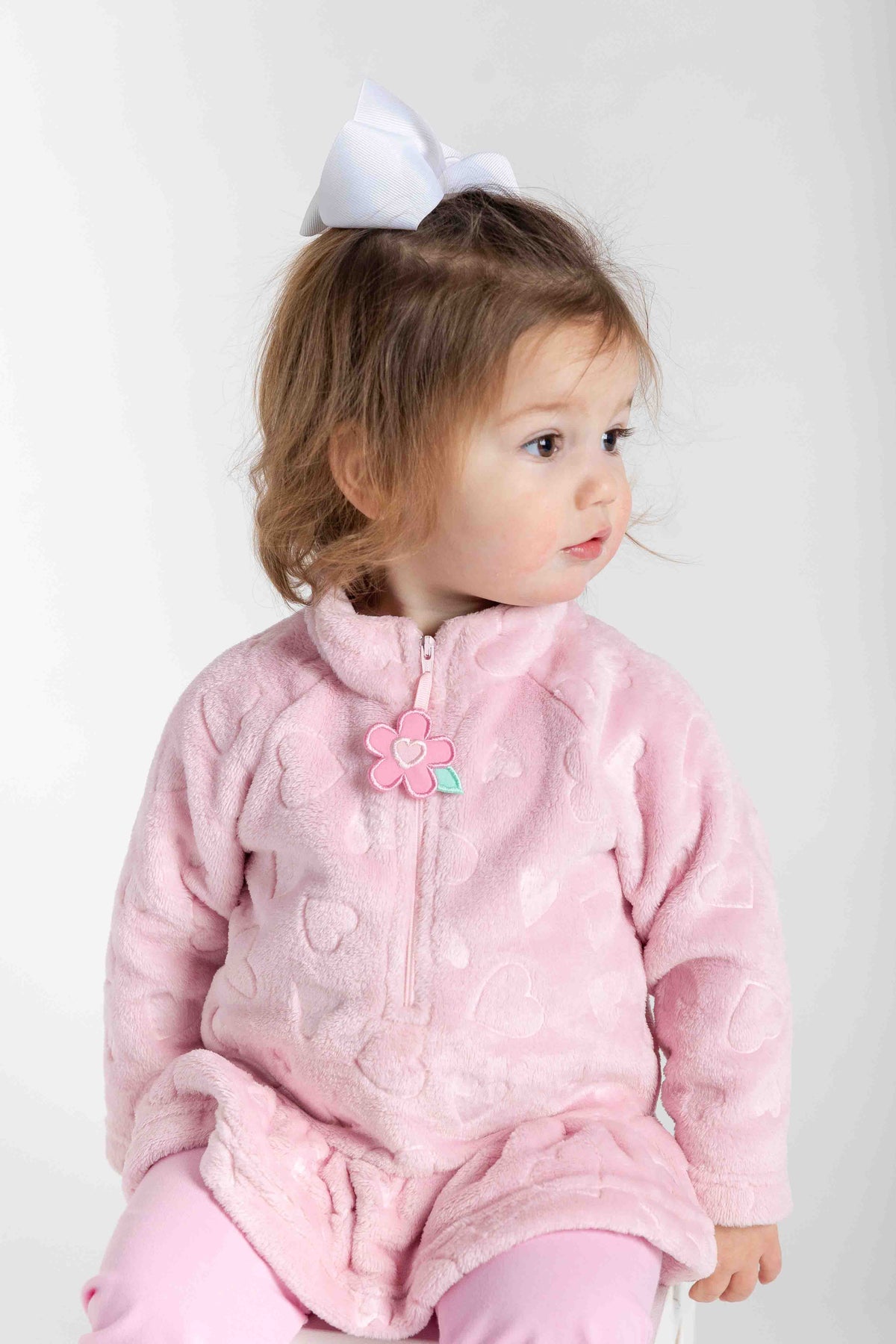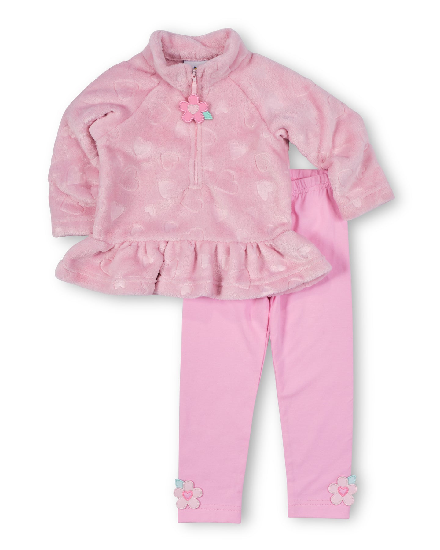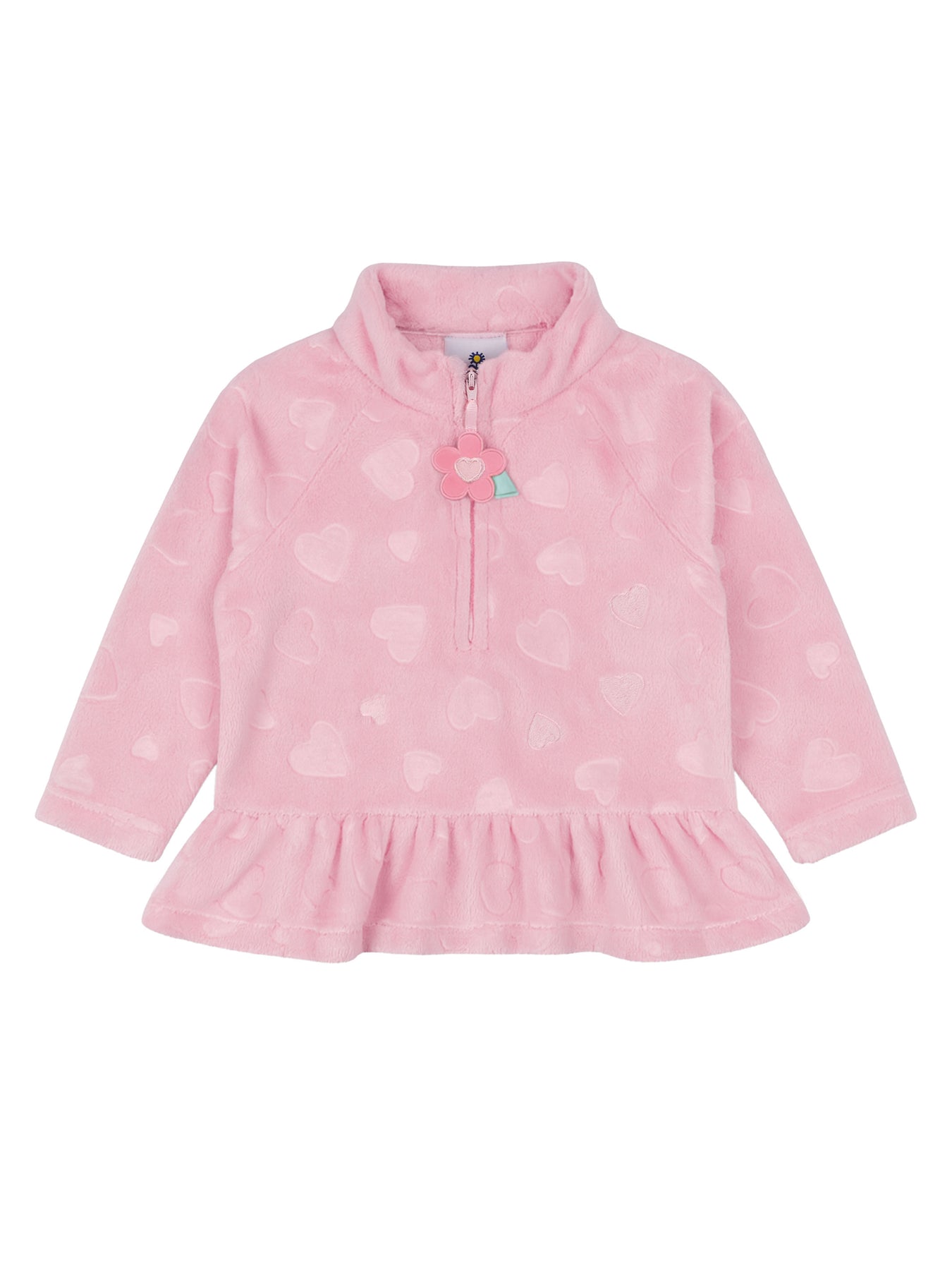 Soft and cozy, this plush fleece top features a subtle heart burnout pattern for playful texture. A navy zipper at the stand neck is finished with an appliqué flower zipper pull, adding a sweet detail little ones will love.
