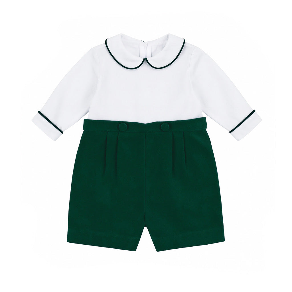 Festive and refined, this all-in-one shortall pairs rich green twill velvet with crisp white piqué for a polished holiday look. The attached shirt features a Peter Pan collar, creating the appearance of a layered ensemble with the ease of a single piece.