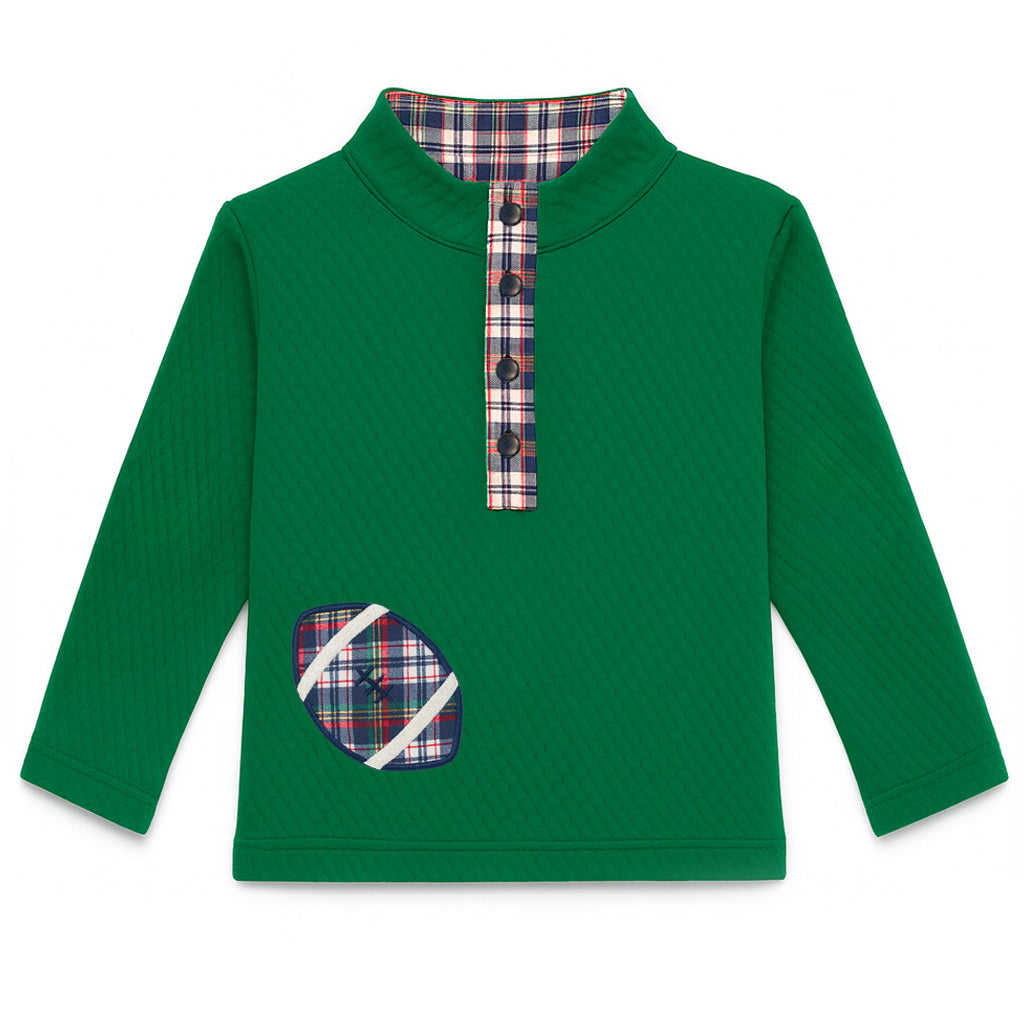 Regular price $84.00Cozy texture meets playful charm in this green jacquard knit pullover. Trimmed in coordinating multi-color plaid, it’s finished with an appliqué football for a touch of fall fun that photographs beautifully.
