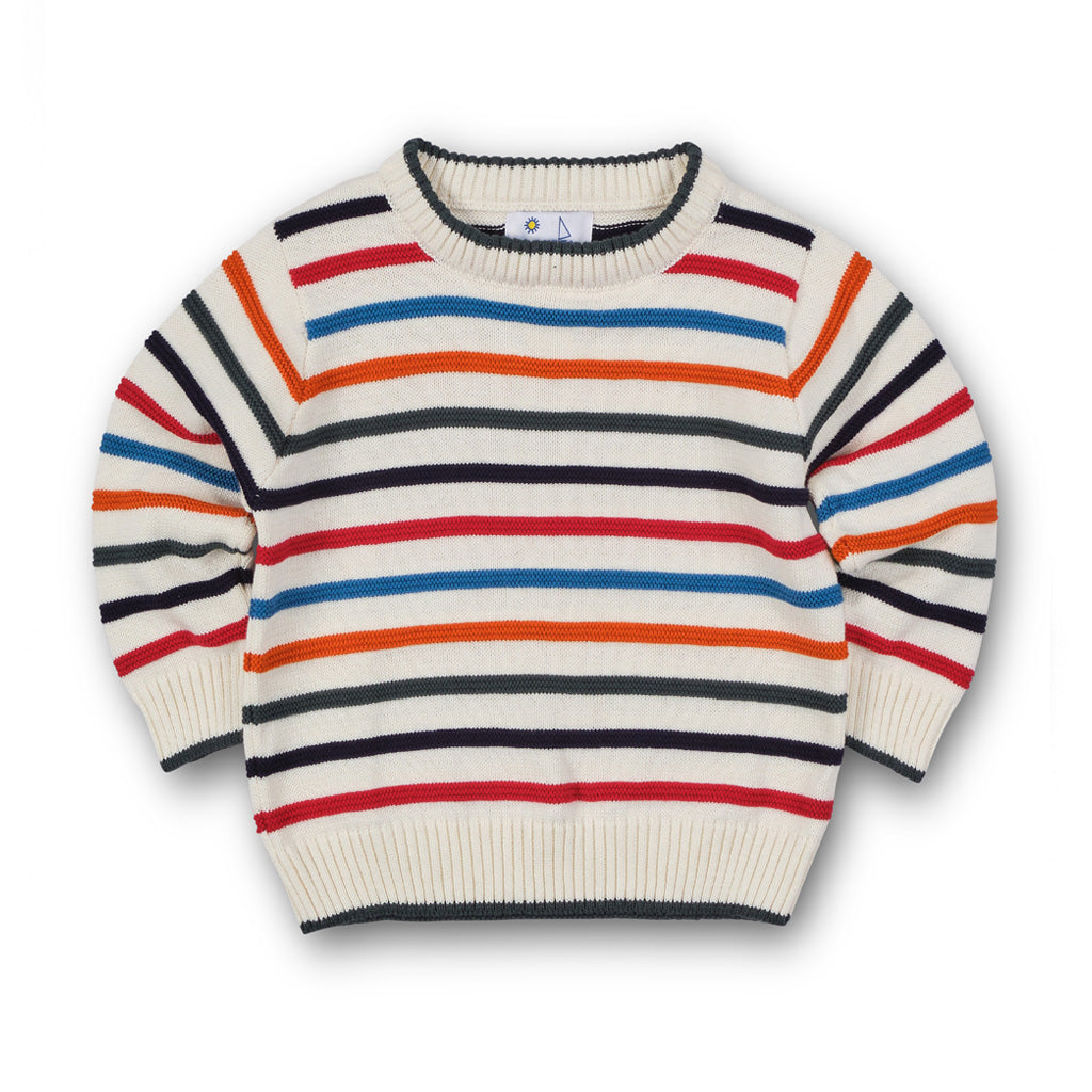 Regular price $92.00A cozy layer with heirloom detail, this ivory cotton sweater is accented with raised stripes in mulberry, rust, slate blue, navy, and tartan green. The textured knit gives the design dimension and charm, while ivory rib trim at the neck and cuffs—tipped in green—adds a polished finish.