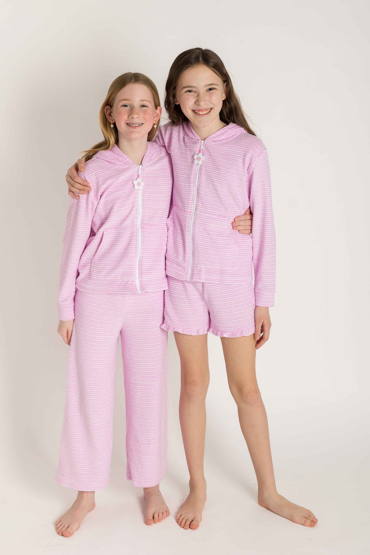 Two children wearing pink coverup sets on a white background