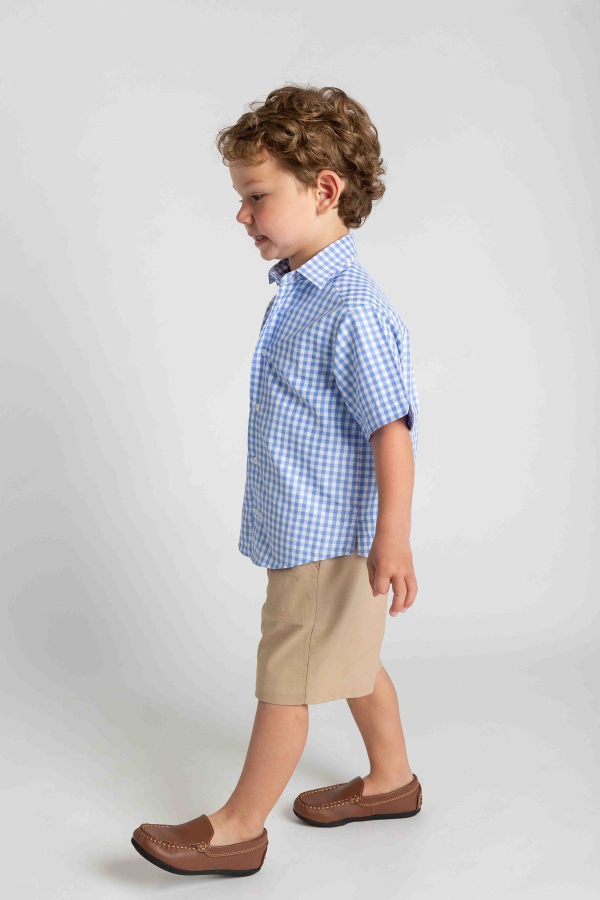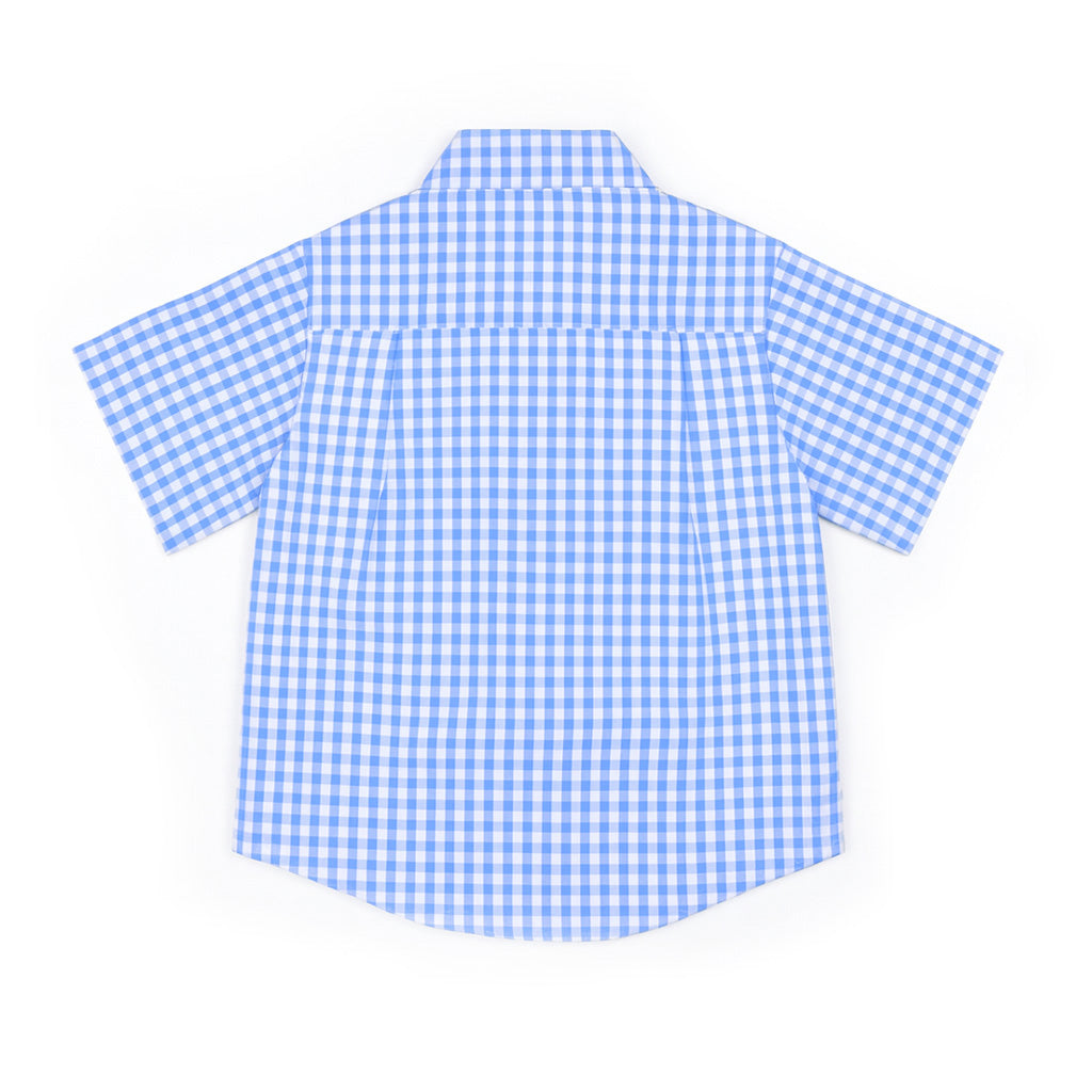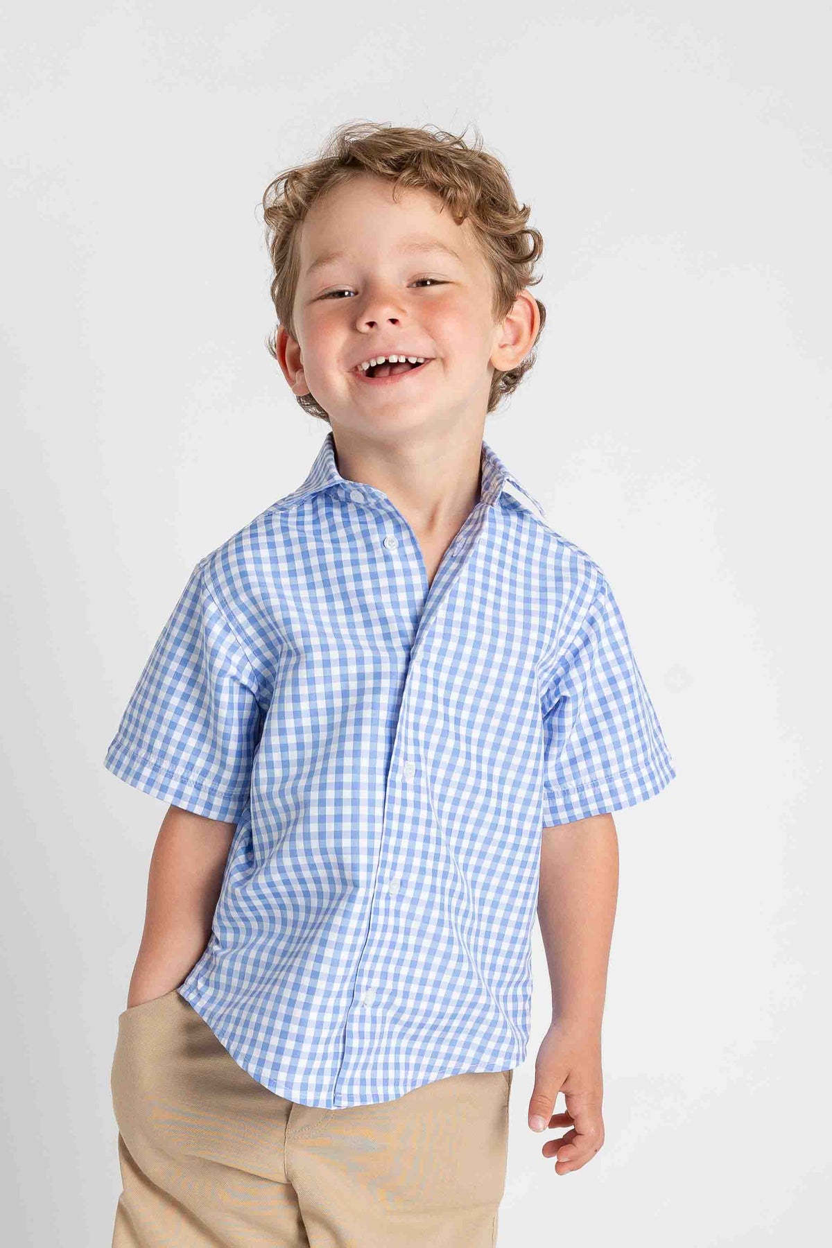 A warm-weather classic, this camp shirt is crafted from lightweight blue and white gingham poplin for a crisp, breathable feel. Short sleeves and side vents keep it cool and comfortable, while a button-front closure adds timeless polish.
