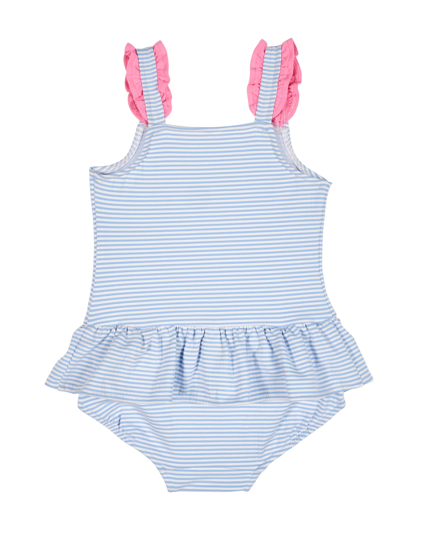 Regular price $108.00Sweet, sunny, and made for splashing, this skirted tank suit is crafted from light blue and white stripe seersucker swim fabric with gentle stretch for a comfortable, secure fit. Bright appliqué flowers bloom across the front, while ruffled straps add playful charm.