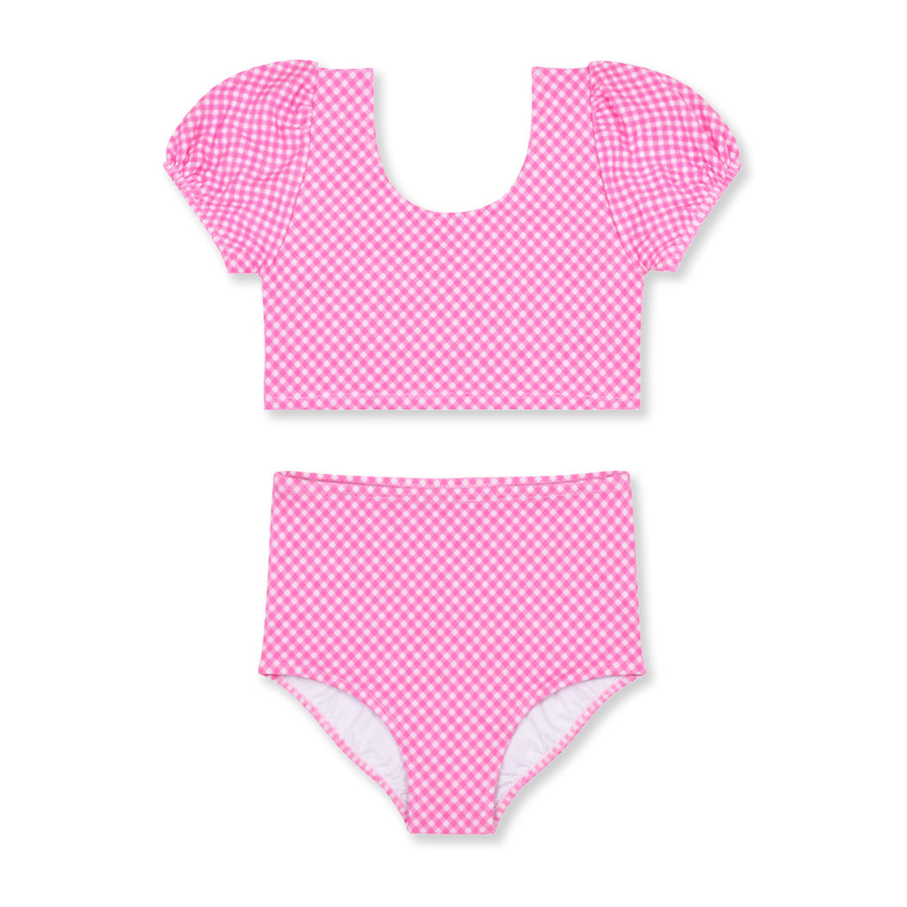 Regular price $108.00Classic with a playful twist, this bikini features a sweet pink and white gingham print on soft, stretchy tricot made with recycled fibers. Puff sleeves add a charming, vintage-inspired touch, while a back tie allows for an adjustable, comfortable fit.