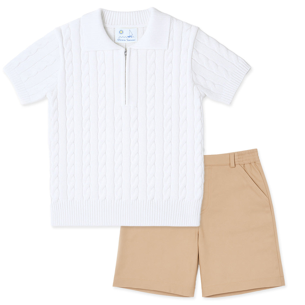 Regular price $88.00Classic and lightweight, this white polo-style sweater is knit from soft 100% cotton with a timeless cable pattern. The short sleeves make it perfect for warm-weather layering, while a front zipper adds a polished, sporty finish.