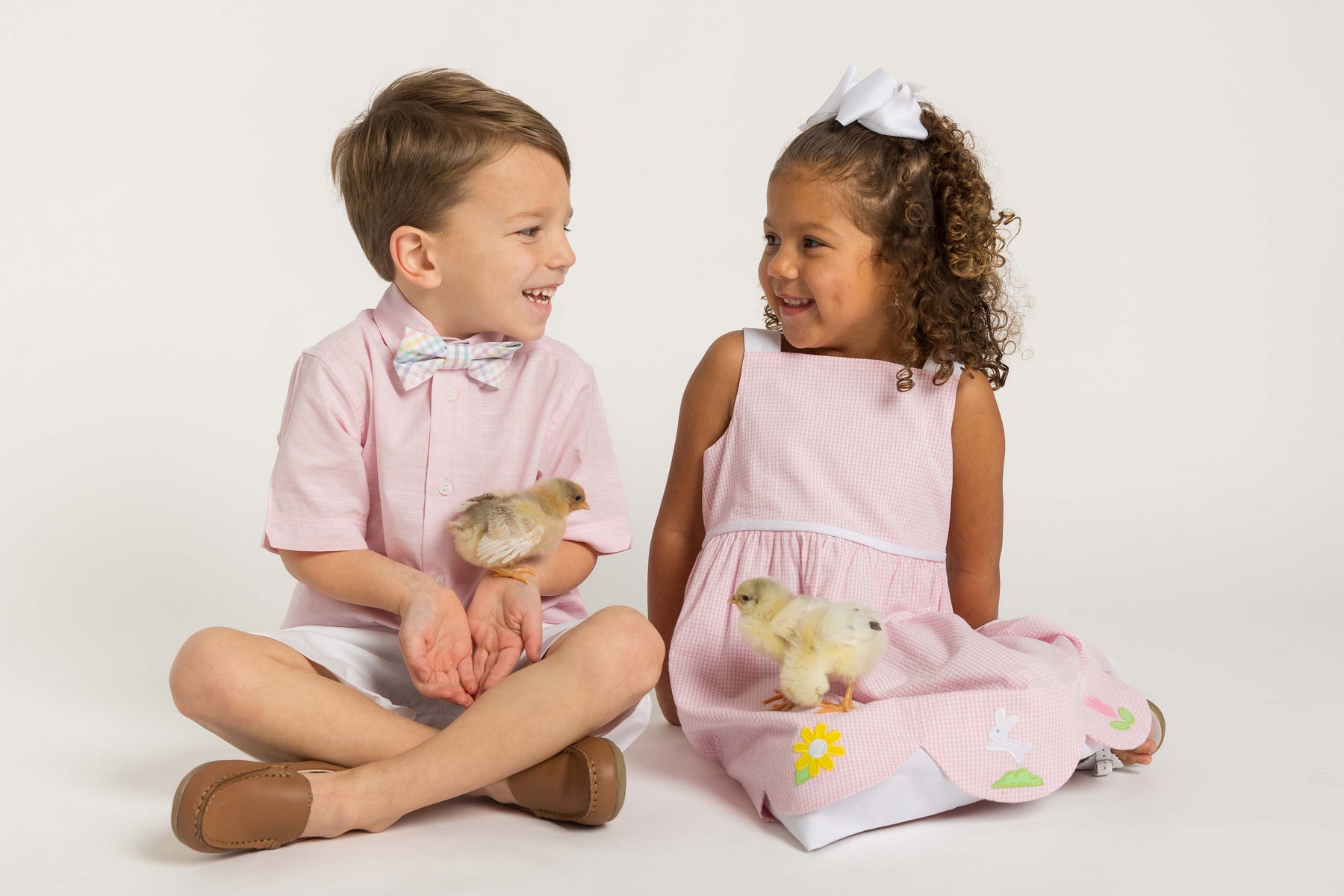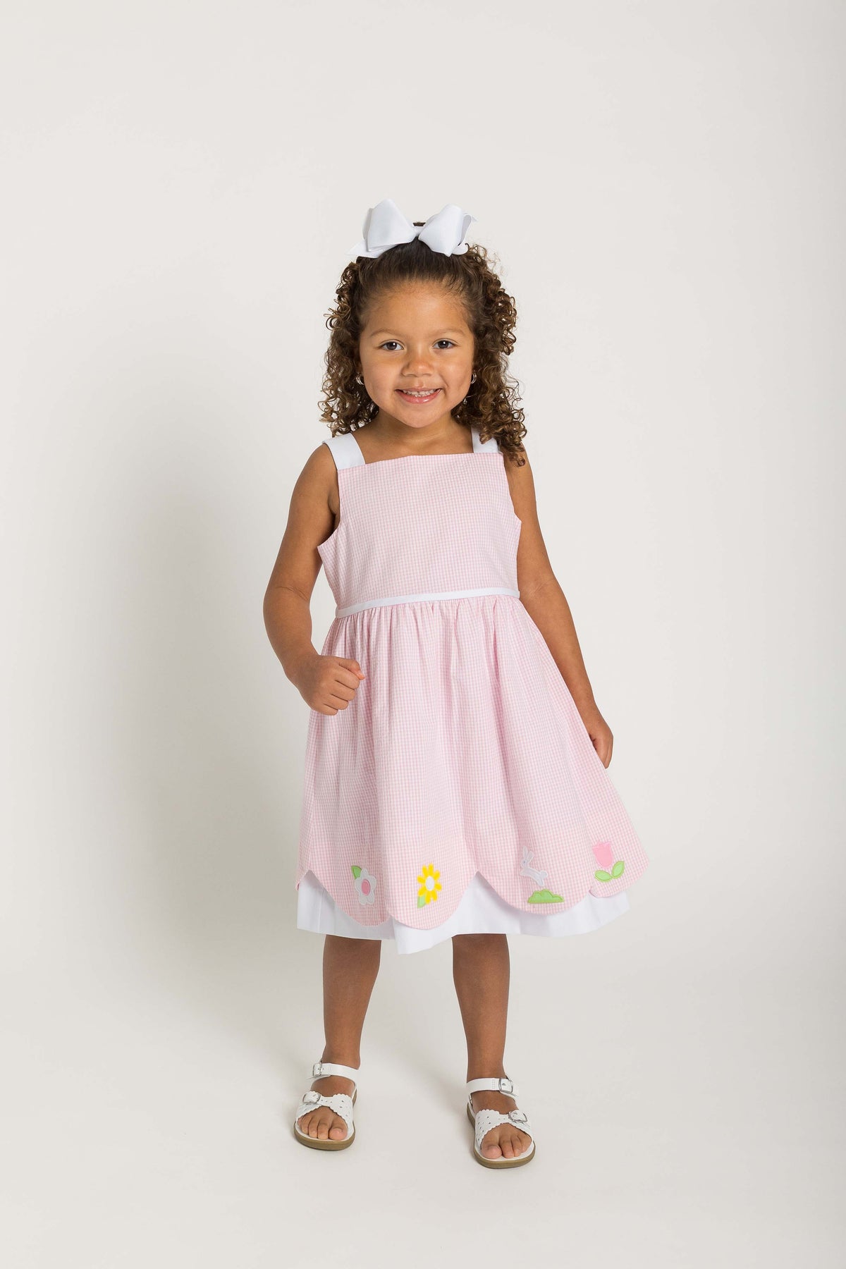 Regular price $112.00Sweet and storybook-perfect, this dress is crafted from pink and white check seersucker in soft, breathable 100% cotton—ideal for any spring celebration. Appliqué flowers and a playful bunny bring cheerful charm, while a scalloped hem adds a delicate finishing touch.