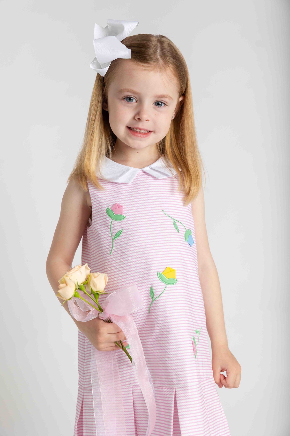 Regular price $132.00Sweet and sunshine-ready, this dress is crafted from pink and white stripe birdseye piqué in soft, breathable 100% cotton—perfect for warm-weather days. Three-dimensional multicolor appliqué tulips bloom across the front, adding cheerful texture and playful charm.