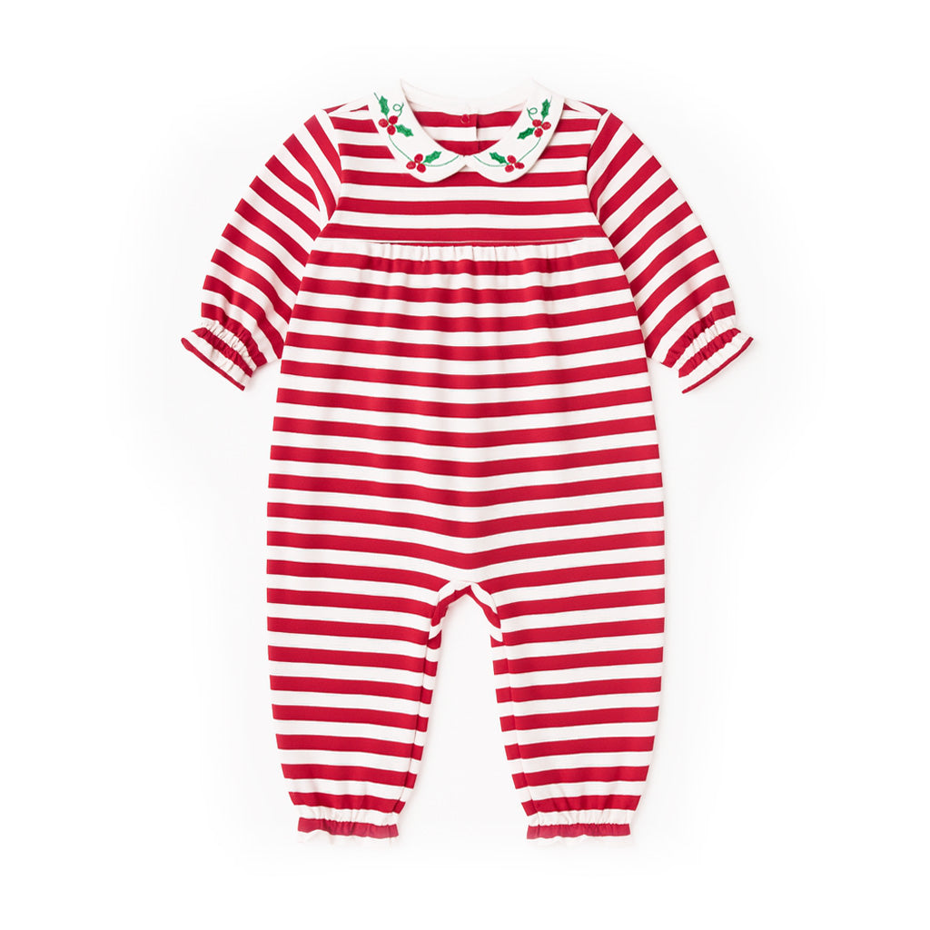 Regular price $92.00 Sale price $69.00Festive and timeless, this longall is crafted from red and white yarn-dyed stripe jersey knit with a soft hint of stretch. A crisp white Peter Pan collar embroidered with holly berries and leaves adds seasonal charm, while a yoke seam with gentle shirring gives the silhouette a sweet finish.