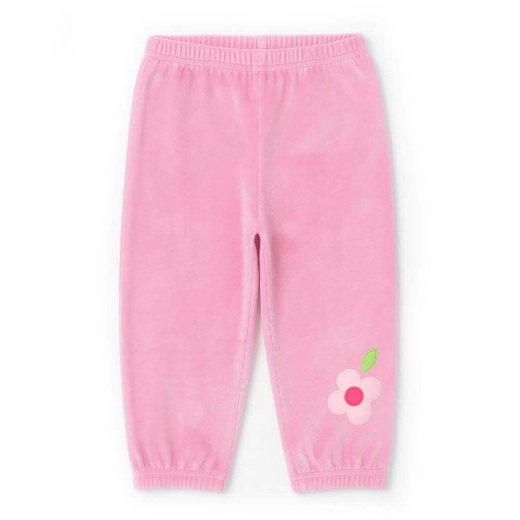 Regular price $52.00Soft and sweet, these jogger pants are made from plush pink velour with a touch of stretch for cozy comfort. A bright appliqué flower blooms on the leg, adding a playful detail to a seasonal staple.