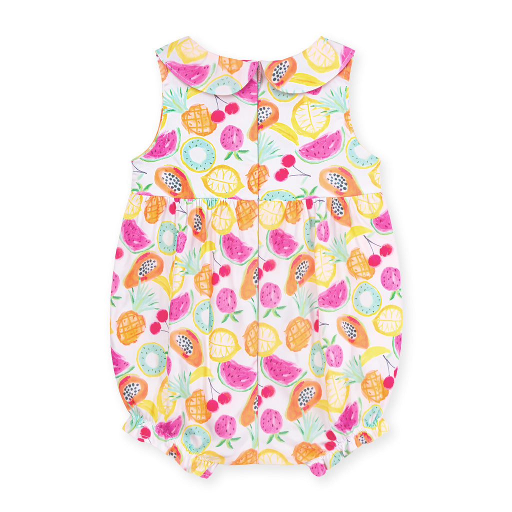 A cheerful fruit print on soft cotton poplin brings a playful, colorful feel to this sweet romper—perfect for sunny days and springtime fun. A softly ruffled neckline adds a charming, polished touch.
